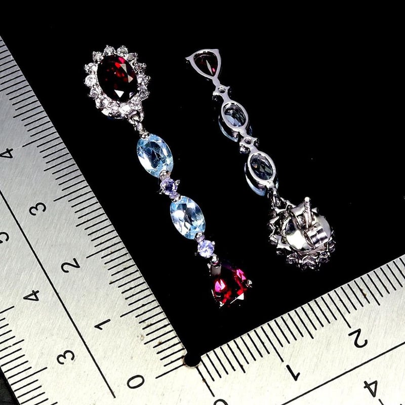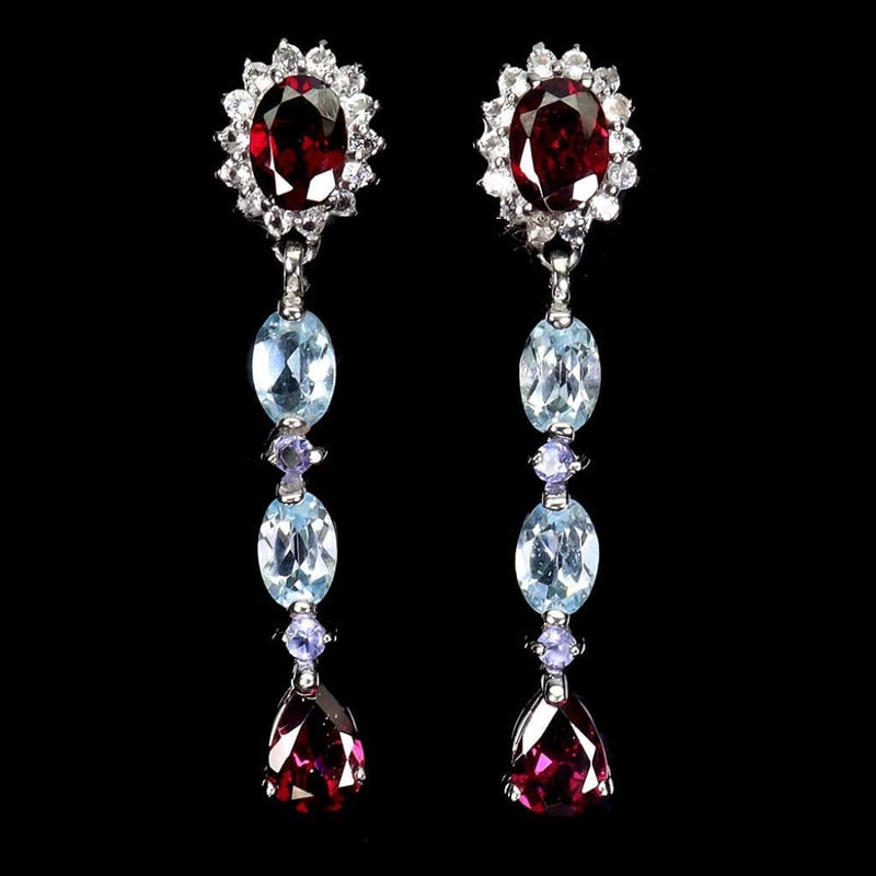 NATURAL GARNET & TOPAZ EARRINGS. Natural Garnet & Topaz Earrings. Made In Solid Sterling Silver And Plated In14K White Gold. Features Natural Rhodolite Garnets, Natural Sky Blue Topaz And Sparkling Czs. Earrings Measure 40.0 X 9.0 Mm. Condition: Good - Refer Images 0488577+8