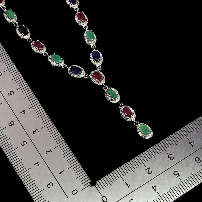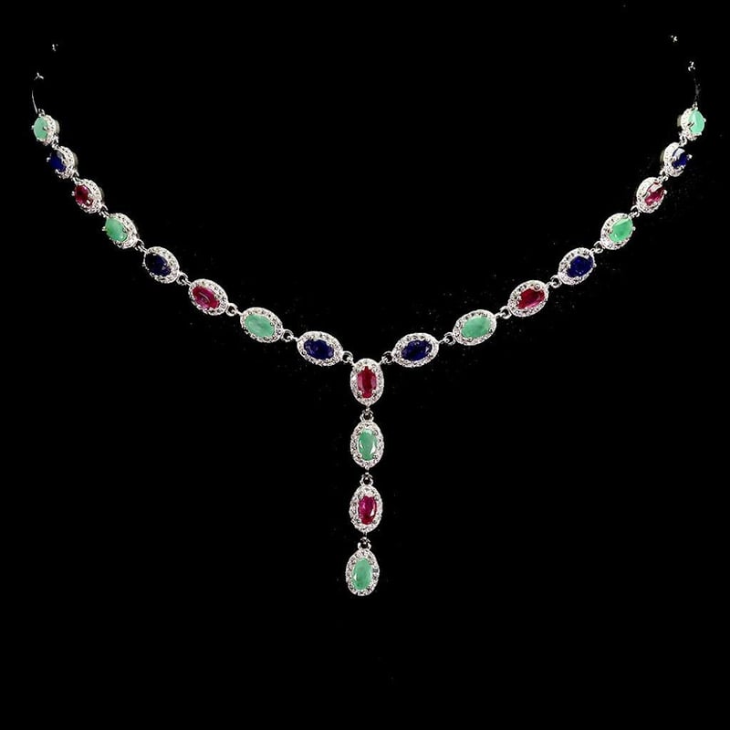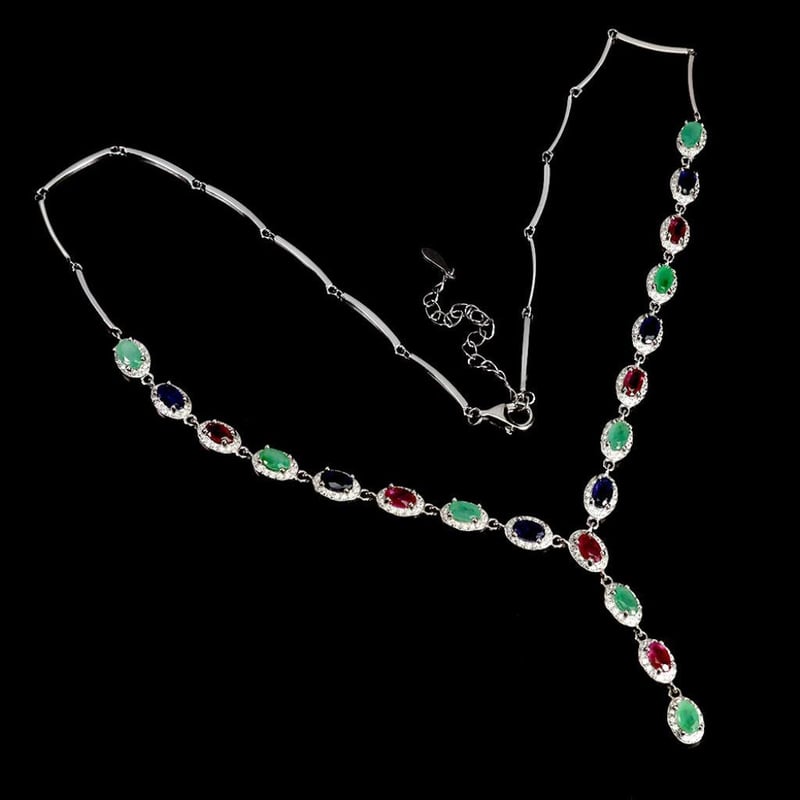 NATURAL RUBY SAPPHIRE & EMERALD TENNIS NECKLACE. Natural Ruby Sapphire & Emerald Tennis Necklace. Made In Solid Sterling Silver And Plated In14K White Gold. Features All Natural Red Rubies, Blue Sapphires And Green Emeralds. Necklace Measures 18 Inches. Condition: Good - Refer Images 0488577+16