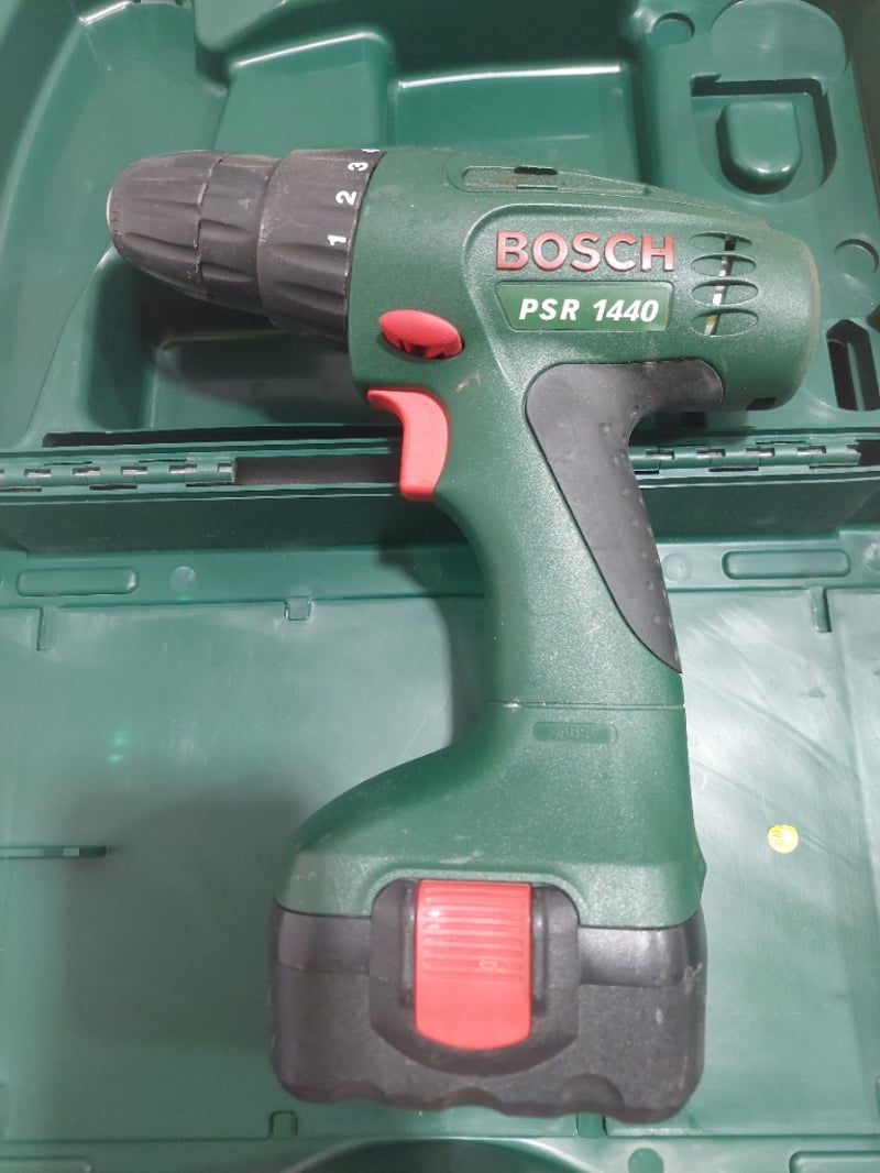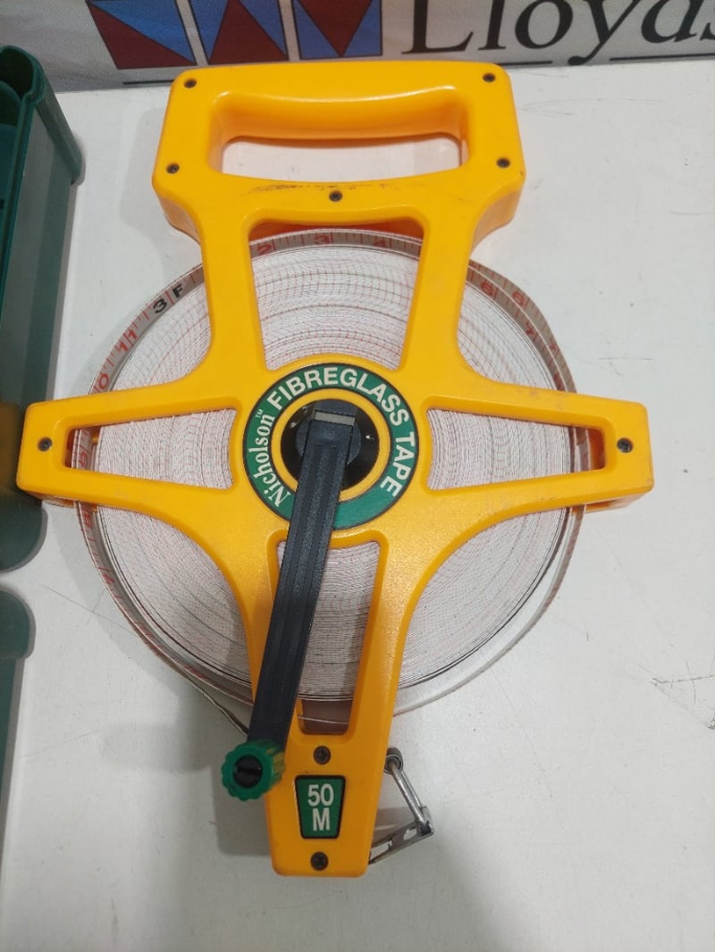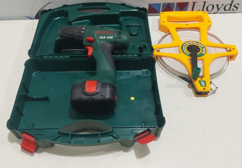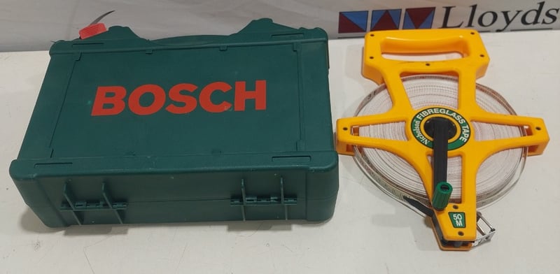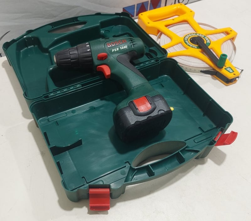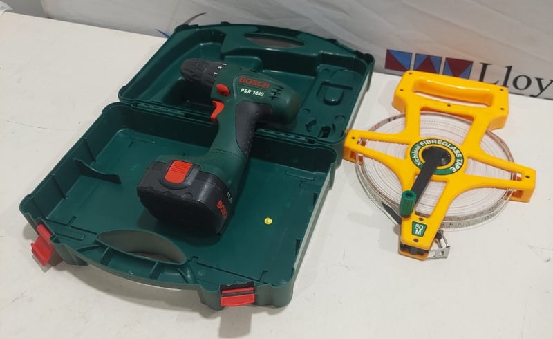 Assorted lot includes, Cordless drill Bosch brand and a Fibreglass measuring tape.