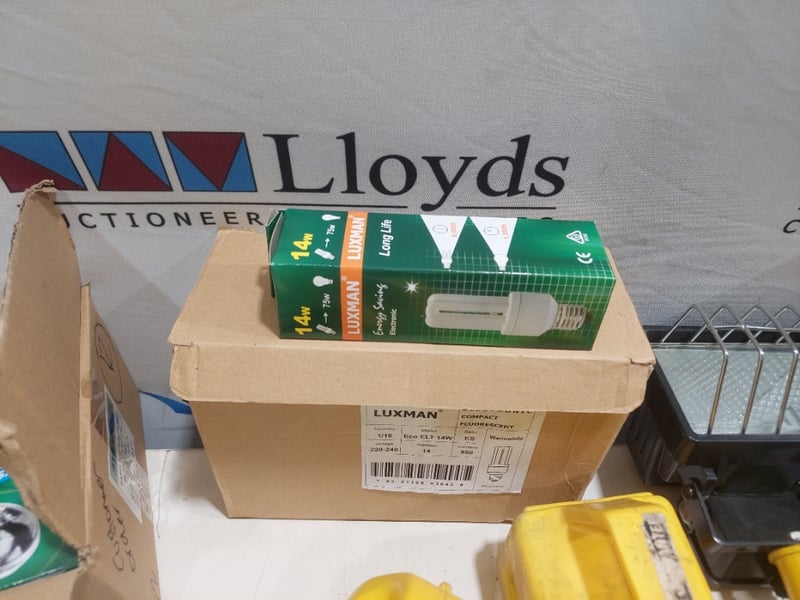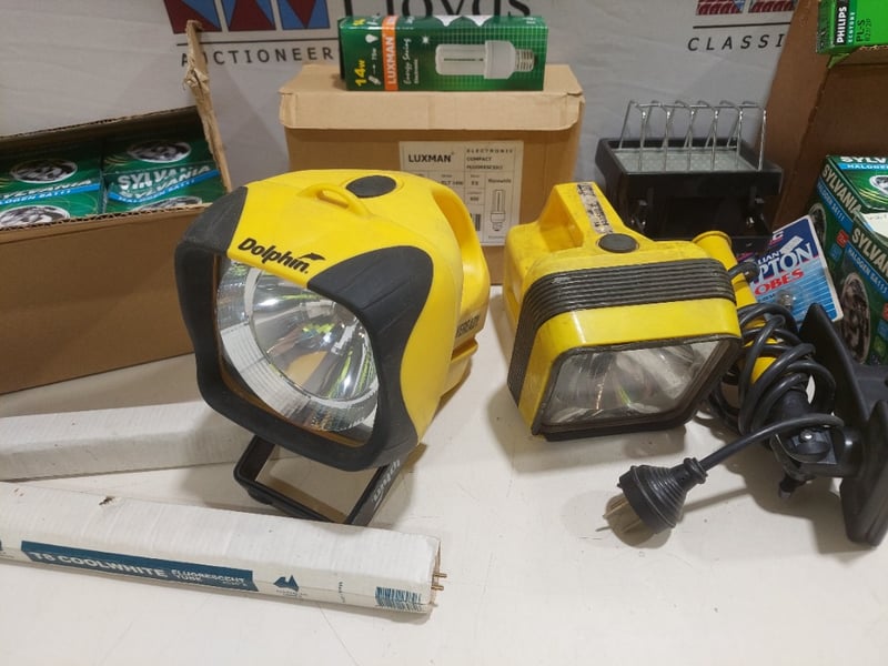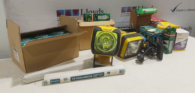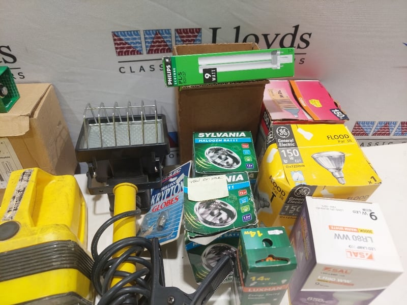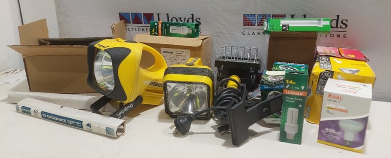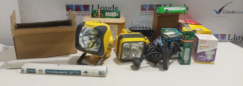 Assorted lot includes, Torches Eveready brand, Halogen lights, fluorescent tubes and more...