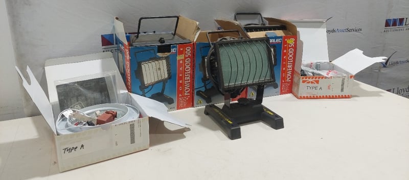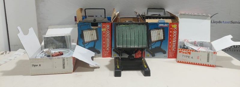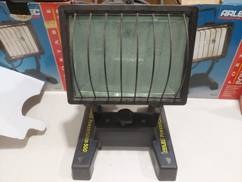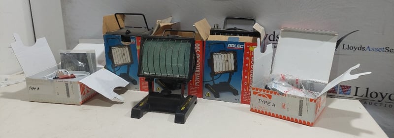 Assorted lot includes, Portable floodlights Arlec brand and ceiling lighting fixtures components. Sold as lot. Notes: items untested and signs of wear.