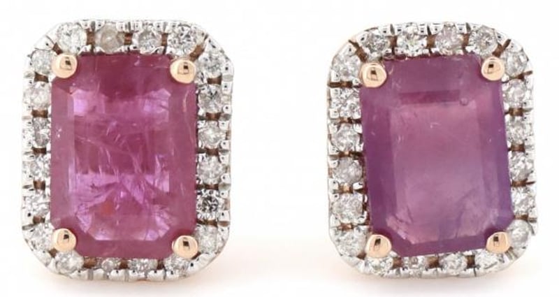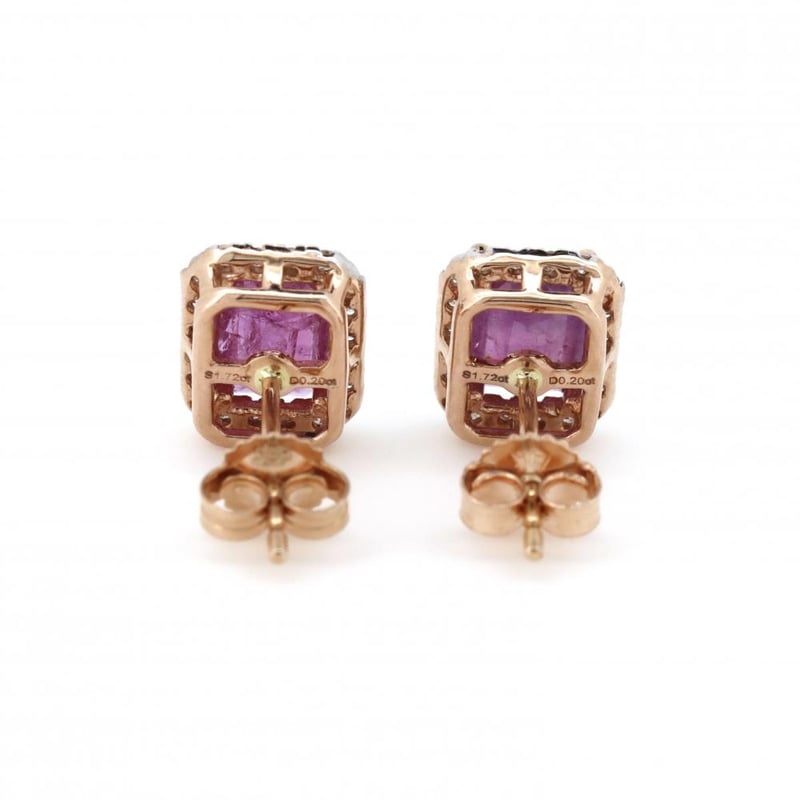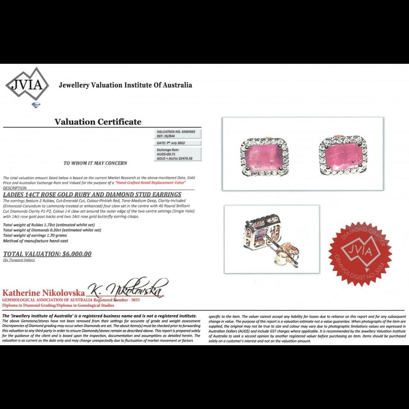 14CT ROSE GOLD, RUBY AND DIAMOND, HALO STUD EARRINGS. The Centres Feature, 2 Emerald Cut, Pinkish-Red, Rubies (1.72Ct Tsw, Included, Enhanced), 4 Claw Set. Surrounding The Centres In Halos Are, 40 Round Brilliant Cut, Diamonds (0.20Ct Tdw, J-K Colour, P1-P2 Clarity), Claw Set. The Earrings Have Post Backs, With 14Ct Rose Gold Butterfly Clasps. Condition: Good - Refer To Images This valuation has been conducted by an independent third-party professional. The valuation amount is an assessment by the issuing valuer and does not reflect the auction value of the item. Any inquiries regarding the valuation should be directed to the issuing valuer (refer to contact details on the certificate), as Lloyds Auctions has no affiliation or influence over the valuation, the valuer, or the stated amount. Insurance Replacement Valuation Amount: $6,000.00 SR 233617+1