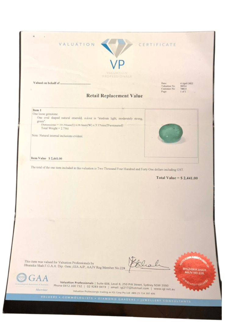 2.79 CT OVAL SHAPED NATURAL EMERALDTotal Item Weight: 0.55gCondition: Good - Refer To ImagesThis valuation has been conducted by an independent third-party professional. The valuation amount is an assessment by the issuing valuer and does not reflect the auction value of the item.Any inquiries regarding the valuation should be directed to the issuing valuer (refer to contact details on the certificate), as Lloyds Auctions has no affiliation or influence over the valuation, the valuer, or the stated amount.Insurance Replacement Valuation Amount: $2,441.00584492+1