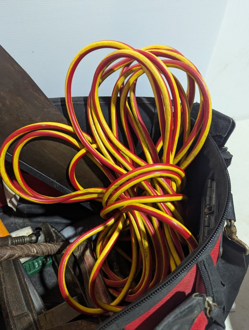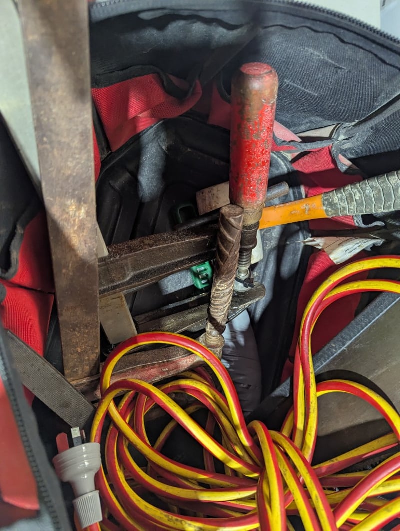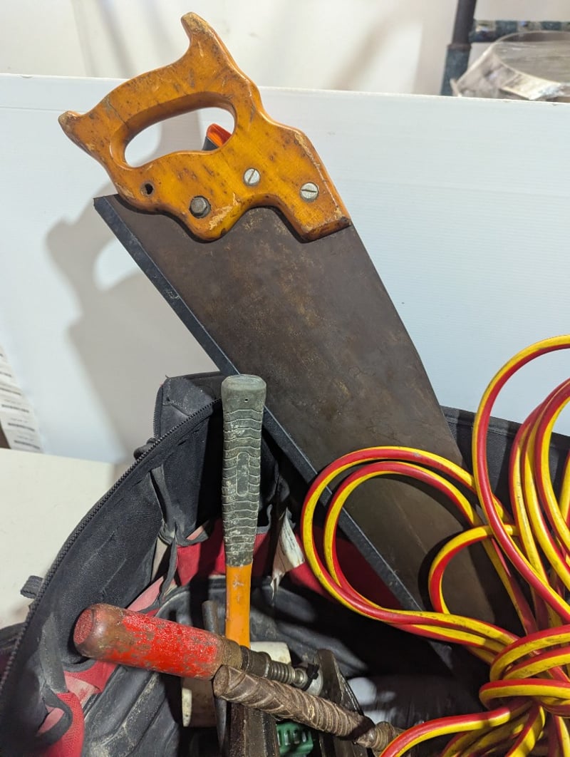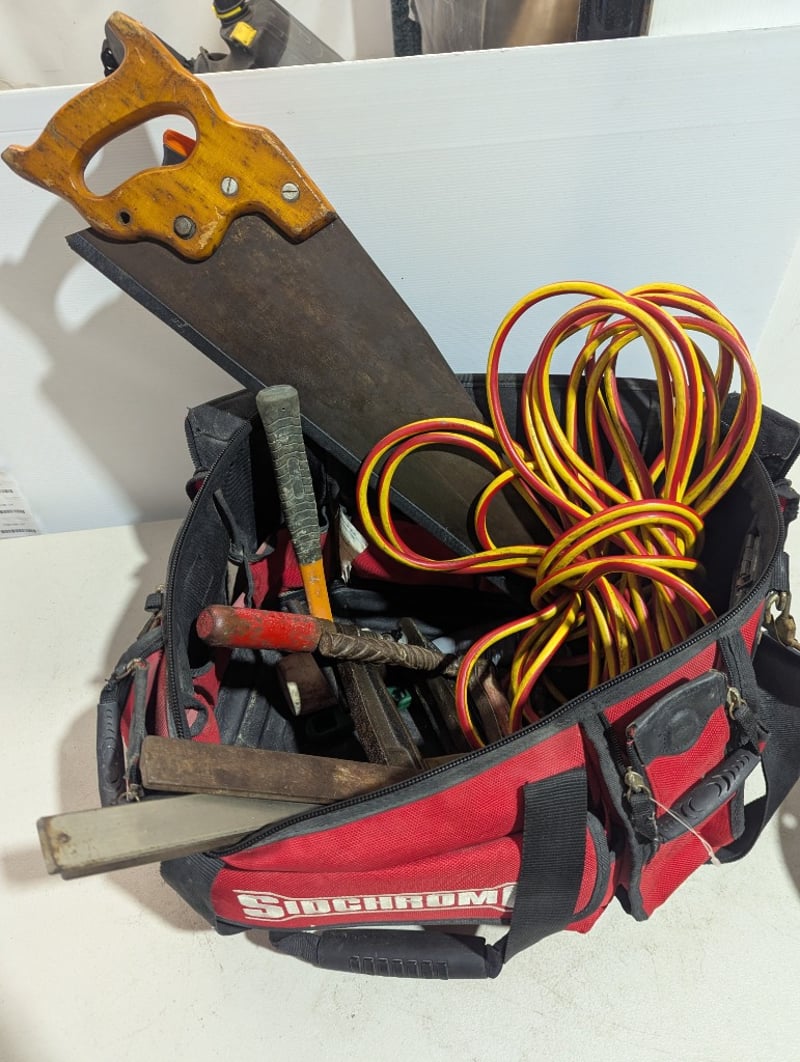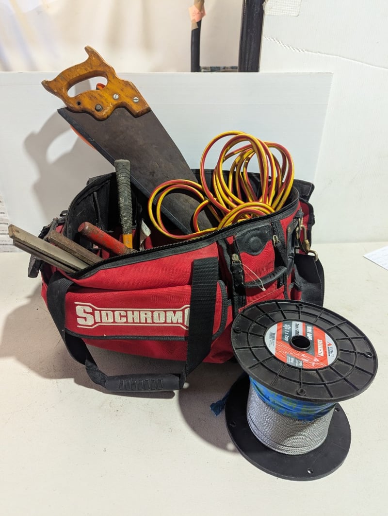 Sidchrome tool bag with assorted tools, including galvanized wire rope, hand saws, extension cord and more SOLD AS LOT