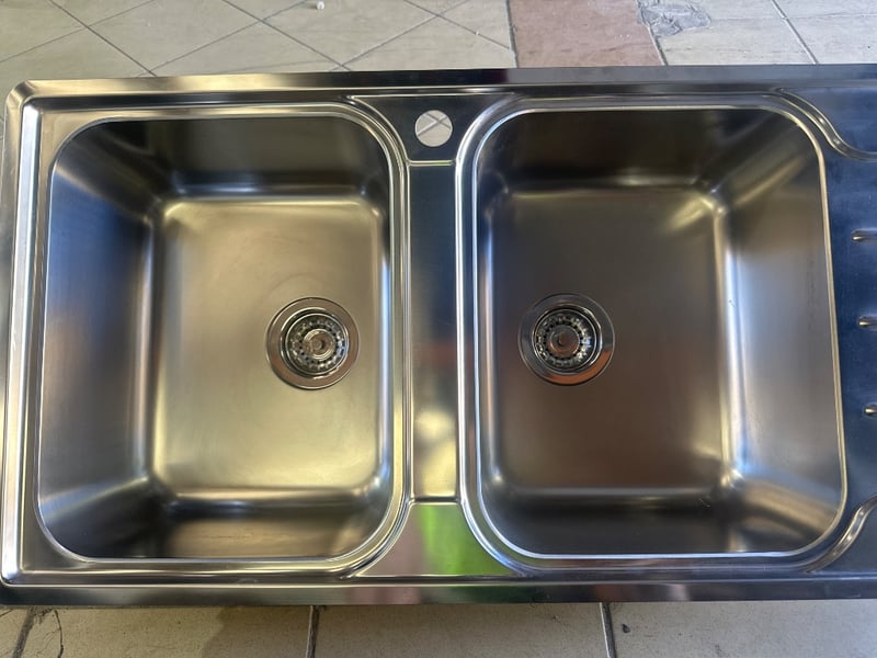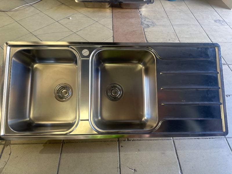 Ex-Display double sink, Silver in colour NOTE NO PARTS INCLUDED Dimensions W50cm x L116cm x D21cm