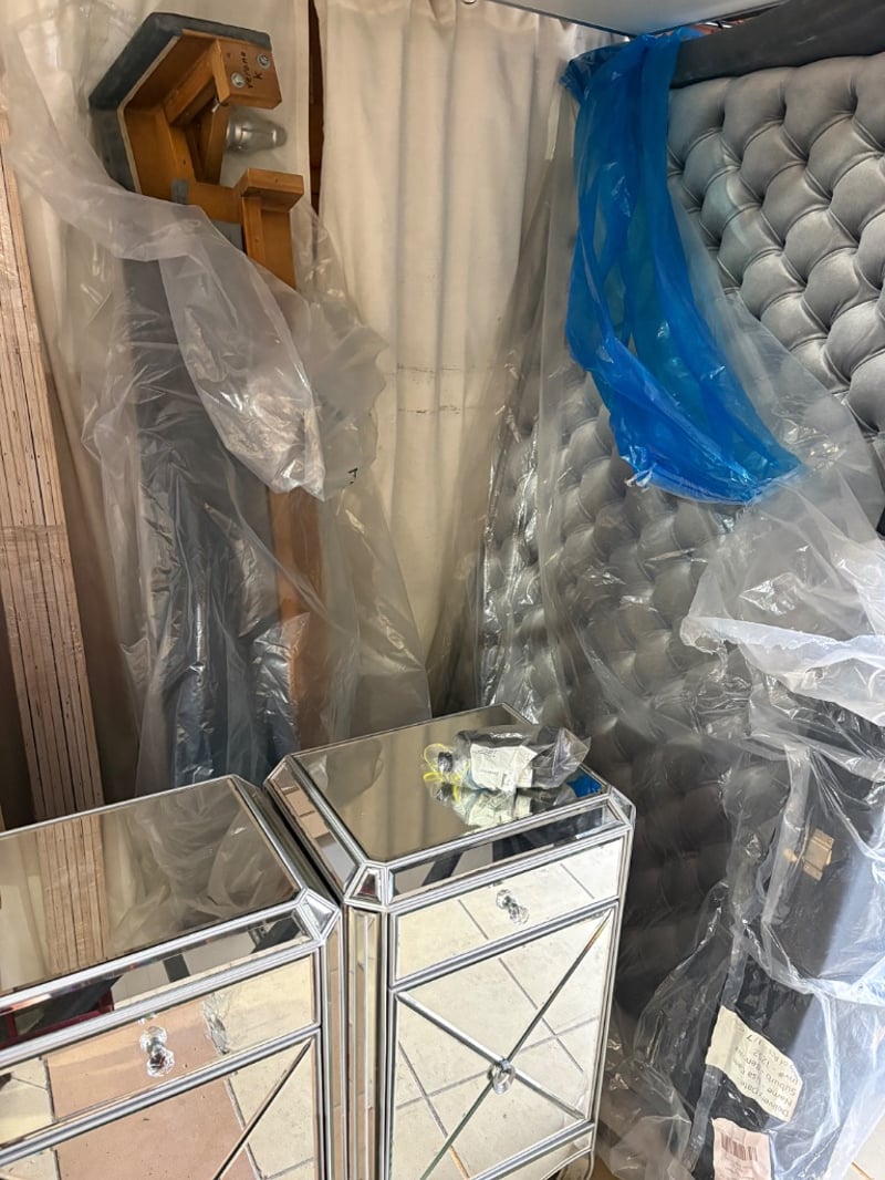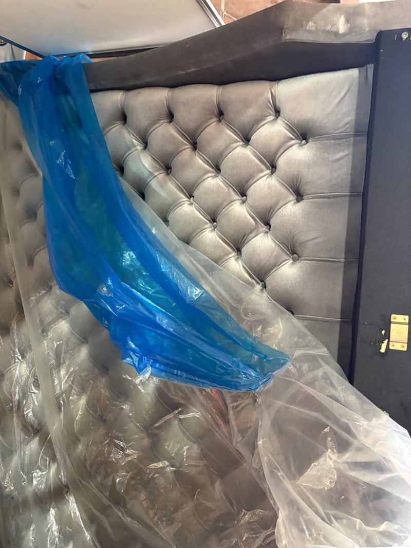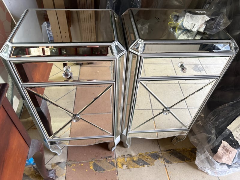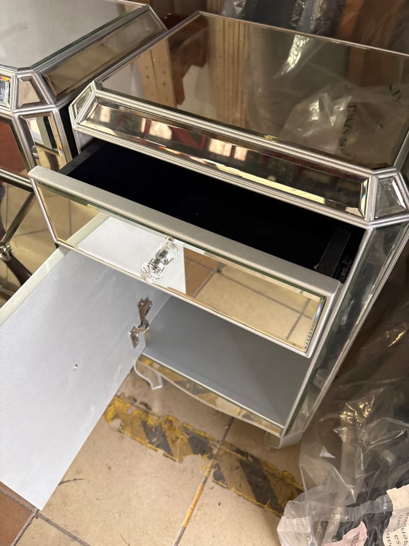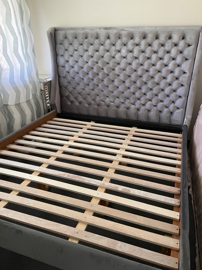 King Size Padded Grey Headboard and Bed Frame + 2 Mirrored Bedside Tables