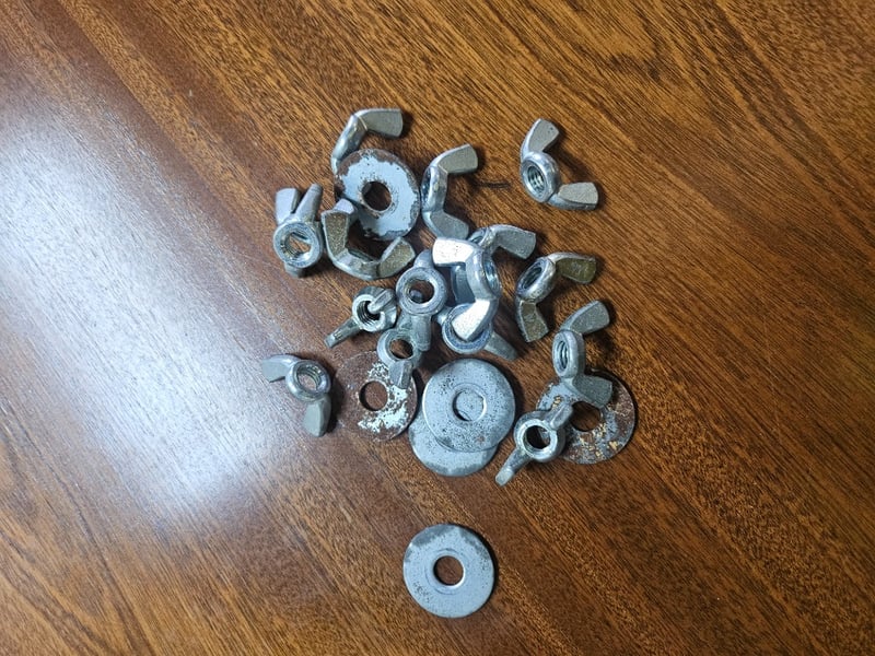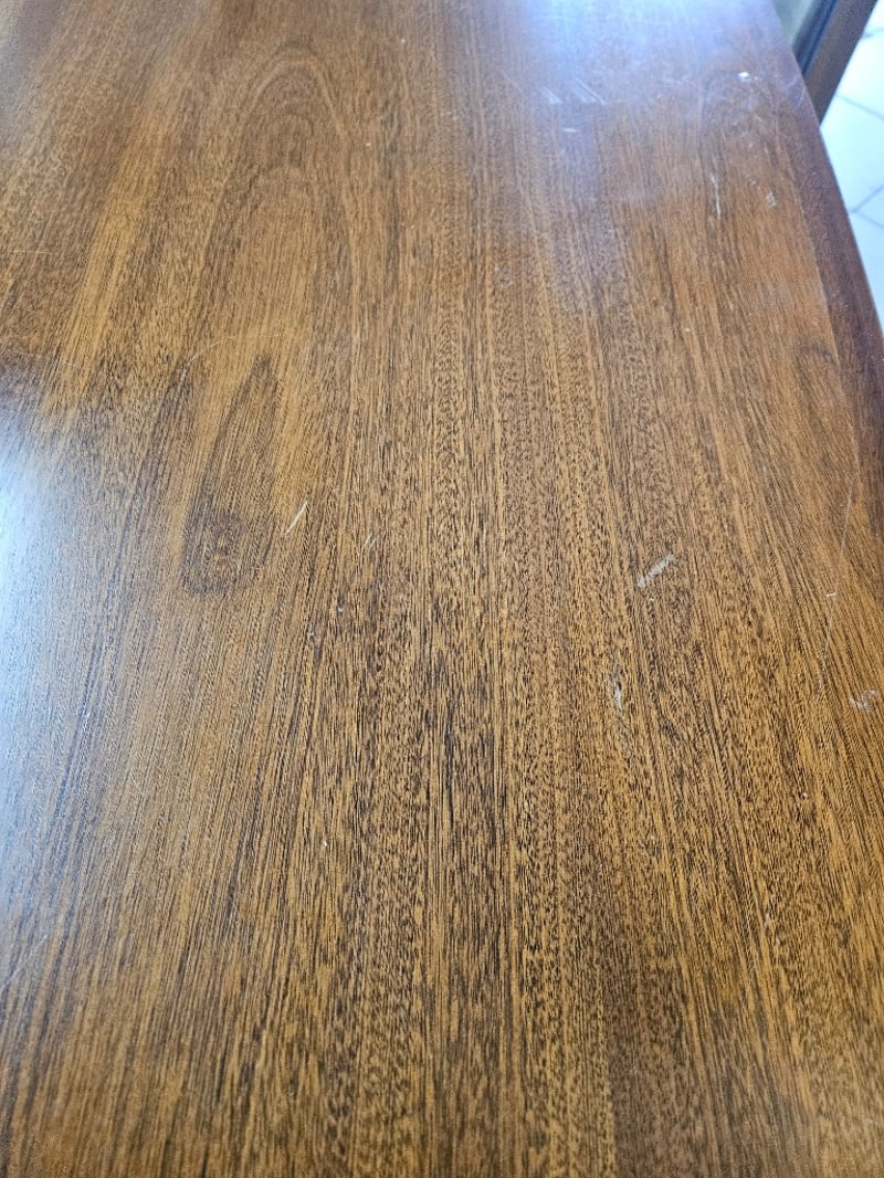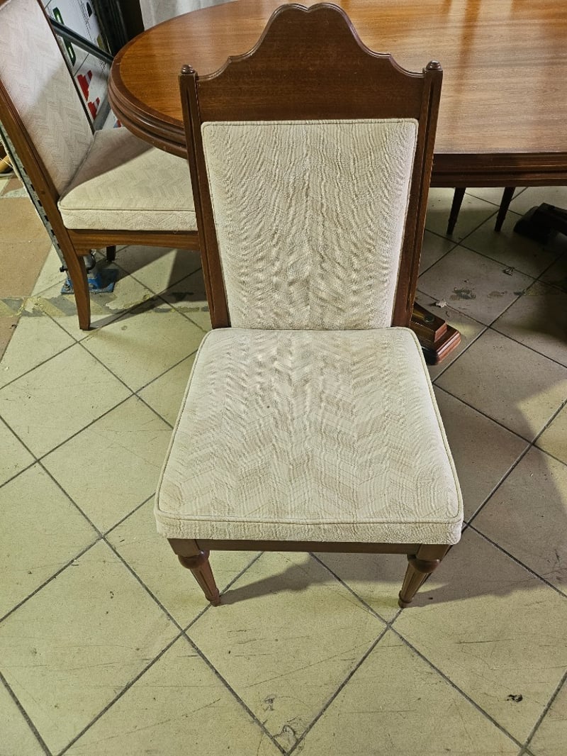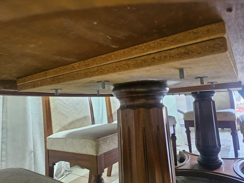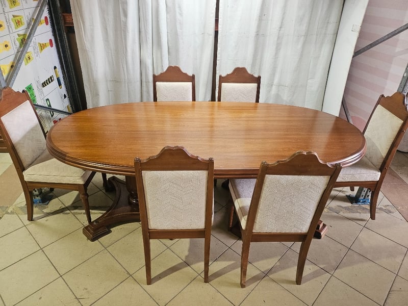 Dining Table with 6 Chairs, Nuts and Washers Included, Scratches and Dents visible DIMENSIONS (TABLE): 72 cm (H), 108 cm (W), 215 cm (L) DIMENSIONS (CHAIRS): 100 cm (H), 47 cm (W), 50 cm (L)