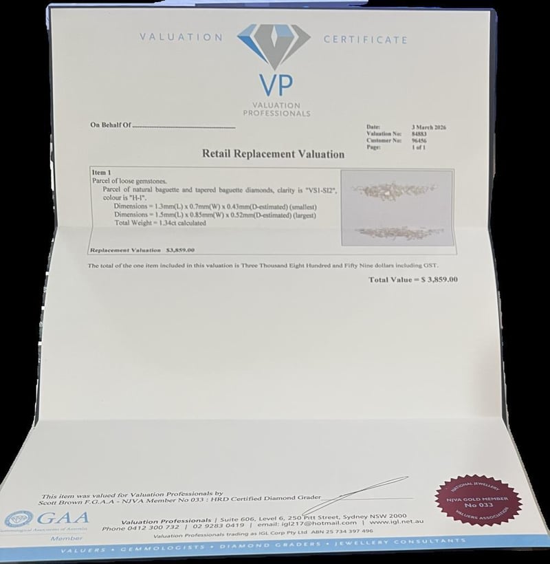 1.34 CARAT NATURAL BAGGETTE & TAPERED DIAMOND Valuations Provided by an Independent Third-Party Professional Not Directly Associated With Lloyds Auctions at AUD $3859This valuation has been conducted by an independent third-party professional. The valuation amount is an assessment by the issuing valuer and does not reflect the auction value of the item. Any inquiries regarding the valuation should be directed to the issuing valuer (refer to contact details on the certificate), as Lloyds Auctions has no affiliation or influence over the valuation, the valuer, or the stated amount. Condition: Good - Refer Images 0311192+1