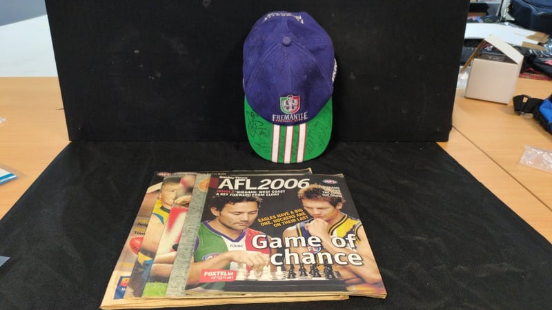 FREMANTLE DOCKERS FOOTBALL CLUB COLLECTORS ITEMS 1X Hat Signed By Whole Team, 5X Afl Newspapers Condition: Good - Refer To Images SR 233570+40