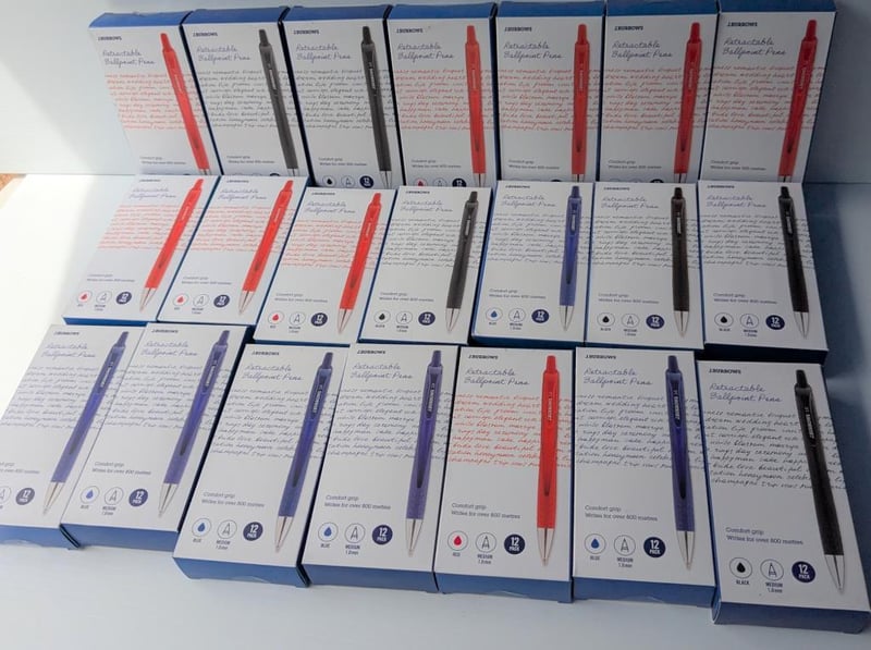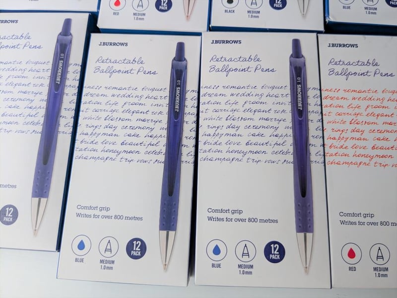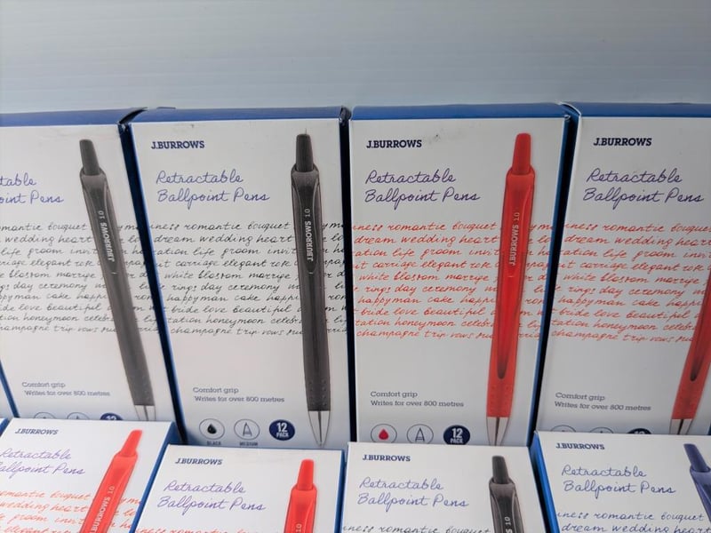 Bulk lot of J Burrows retractable ballpoint pens, $315 approx value, qty of 21 boxes with 12 pens in each, total 252 pens (sold as lot)