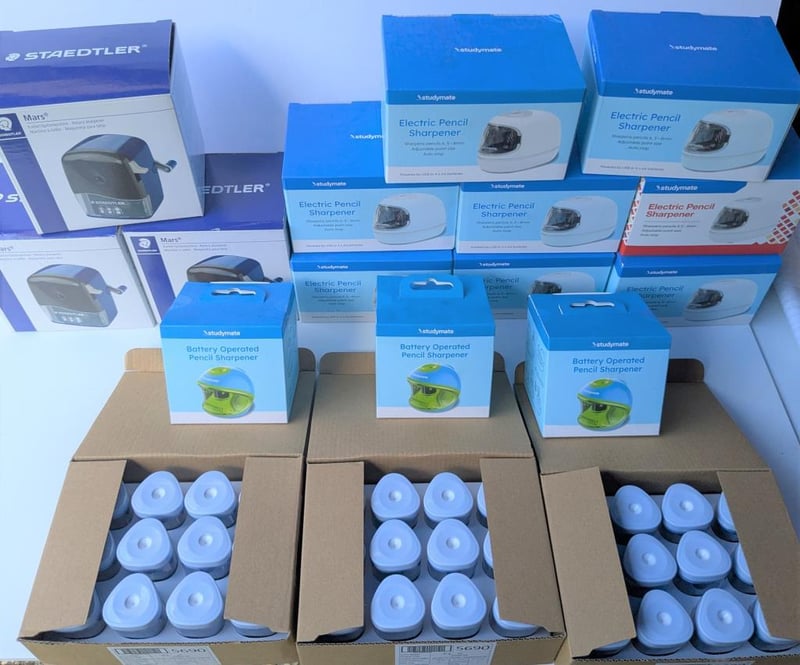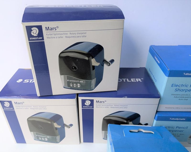 Bulk lot of Staedtler Mars & Studymate electric, rotary, battery & manual sharpeners $440 approx value (sold as lot)