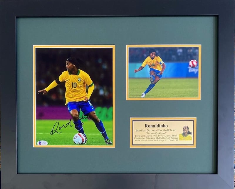 RONALDINHO (BRAZIL) PERSOANLLY SIGNED 10" X 8" PHOTOGRAPH (BECKETT COA)Framed Using Double Mats, 2 Unsigned Photographs And A Plaque. Hand Signed By Ronaldinho Using A Black MarkerAccompanied By A Certificate Of Authenticity From BeckettCondition: Good - Refer Images488575+21