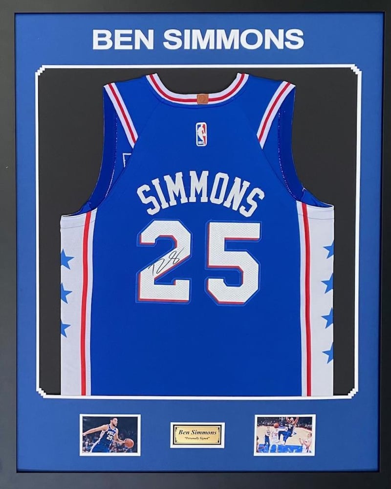 BEN SIMMONS PERONALLY SIGNED PHILADELPHIA 76ERS JERSEY Framed Using Double Mats, 2 Unsigned Photographs And A Plaque. Hand Signed By Ben Simmons Using A Black MarkerAccompanied By A Certificate Of AuthenticityCondition: Good - Refer Images488575+24