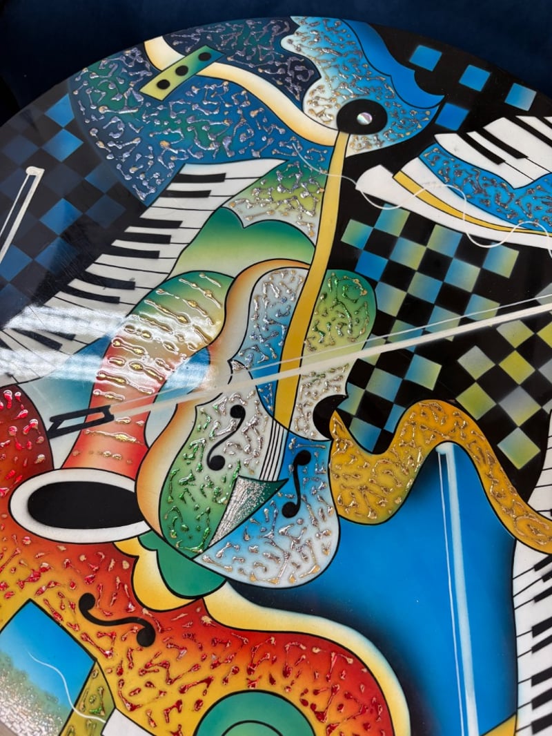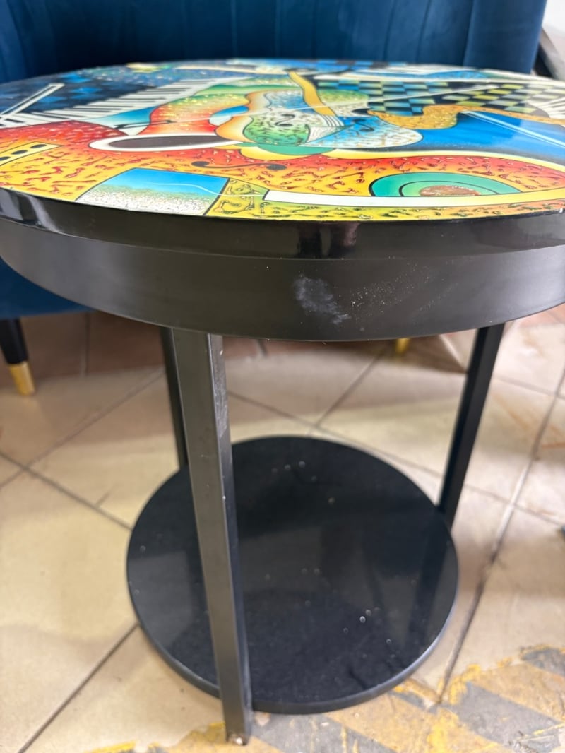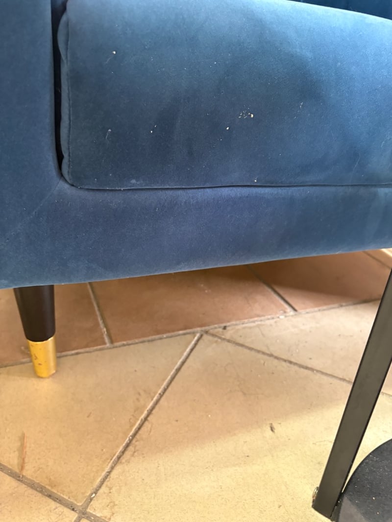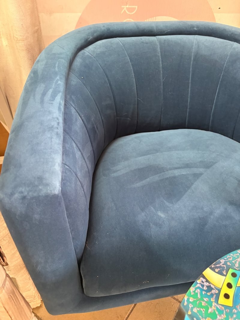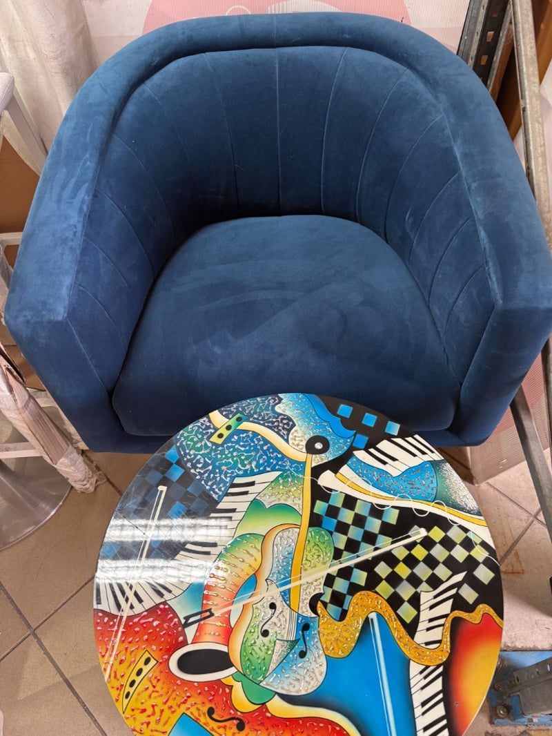Plush blue velvet tub chair with curved back, paired with a colourful glass-top side table.