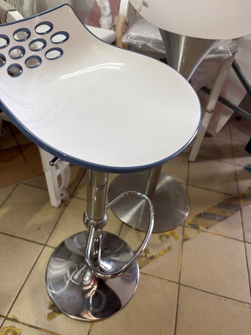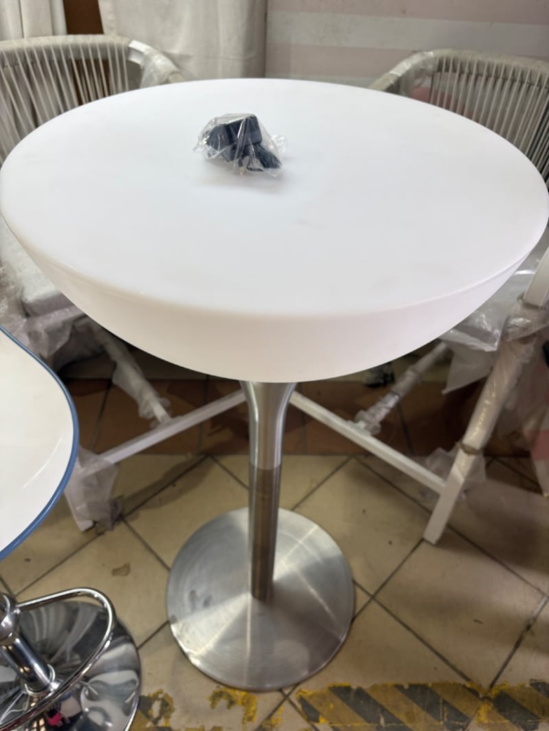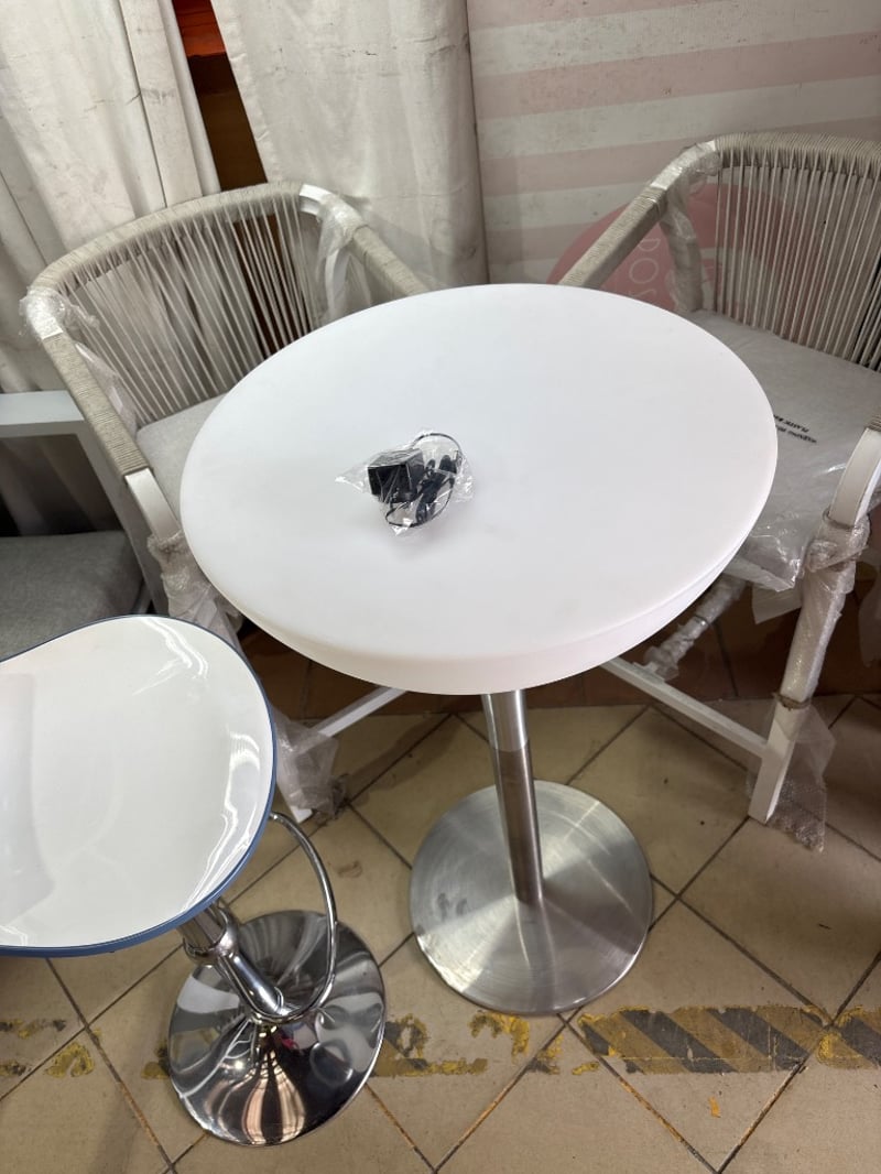 White round bar table, comes with a power cord but light up feature is not working. Includes adjustable stool and two chairs.
