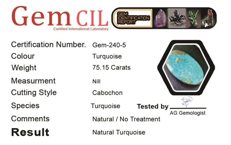 75.15 CARATS NATURAL QUALITY TURQUOISE 75.15 Carats Natural Quality Turquoise Stone = Natural TurquoiseWeight = 75.15 Carats Cut = Cabochon Colour = TurquoiseQuantity = 1Note = Gem Cil, Certified, Condition: Good - Refer Images 0488571+5