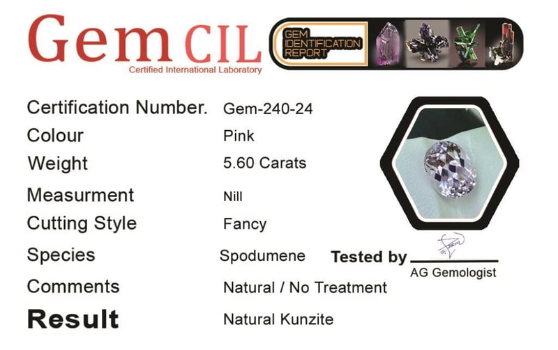 5.60 CARATS NATURAL KUNZITE 5.60 Carats Natural Kunzite Stone = Natural KunziteWeight = 5.60 Carats Colour = PinkCut = Fancy Lustre = ExcellentNote = Gem Cil, Certified, Precise Custom Cut (Not Commercial) Condition: Good - Refer Images 0488571+24