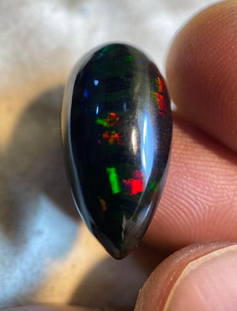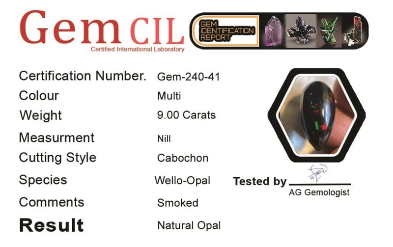 9.00 CARATS NATURAL WELLO-BLACK OPAL 9.00 Carats Natural Wello-Black Opal Stone = OpalWeight = 9.00 CaratsColour = Multi-Colour Treatment = SmokedCut = Cabochon Note = Picture Taken Under Light, Gem Cil, Certified. Condition: Good - Refer Images 0488571+41