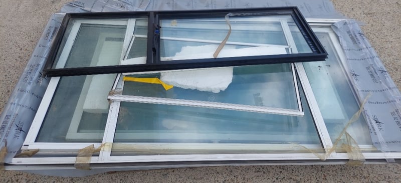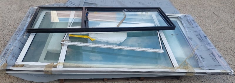 Assorted aluminum framed windows and doors. Various Dimensions.Door: 240x120cmWindow: 115x60cmSold as a lot.