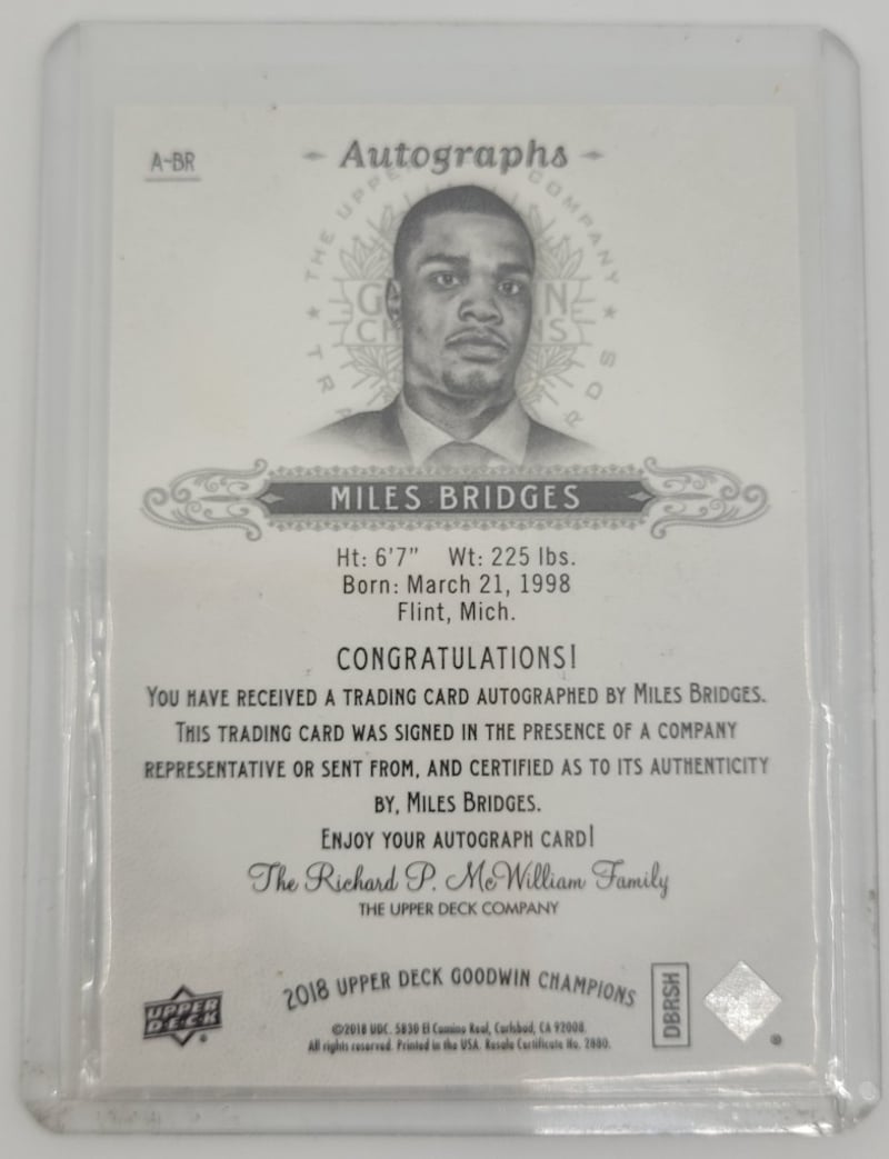 NBA 2018 UPPER DECK GOODWIN CHAMPIONS AUTOGRAPH BASKETBALL CARD, MILES BRIDGES #A-BR Condition: Good - Refer To Images 582908+42