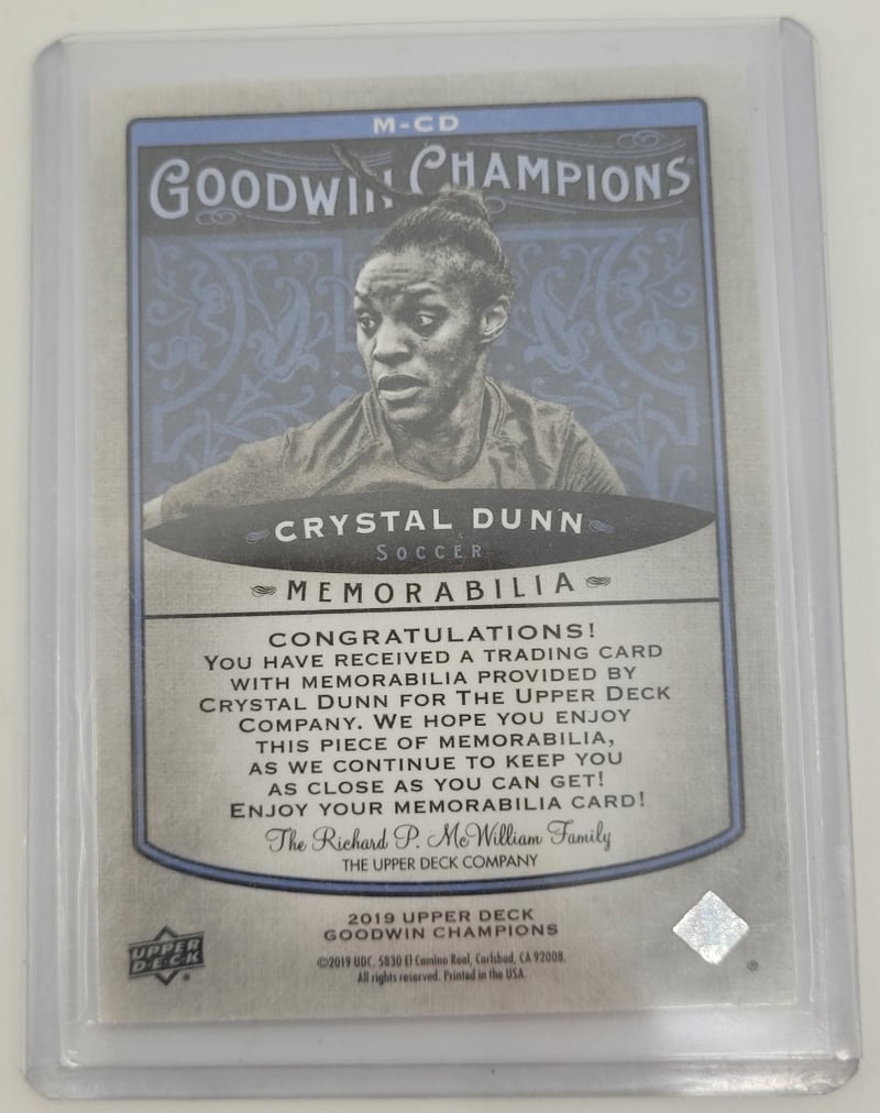 2019 UPPER DECK GOODWIN CHAMPIONS MEMORABILIA SOCCER CARD CRYSTAL DUNN, #M-CD Condition: Good - Refer To Images 582908+45