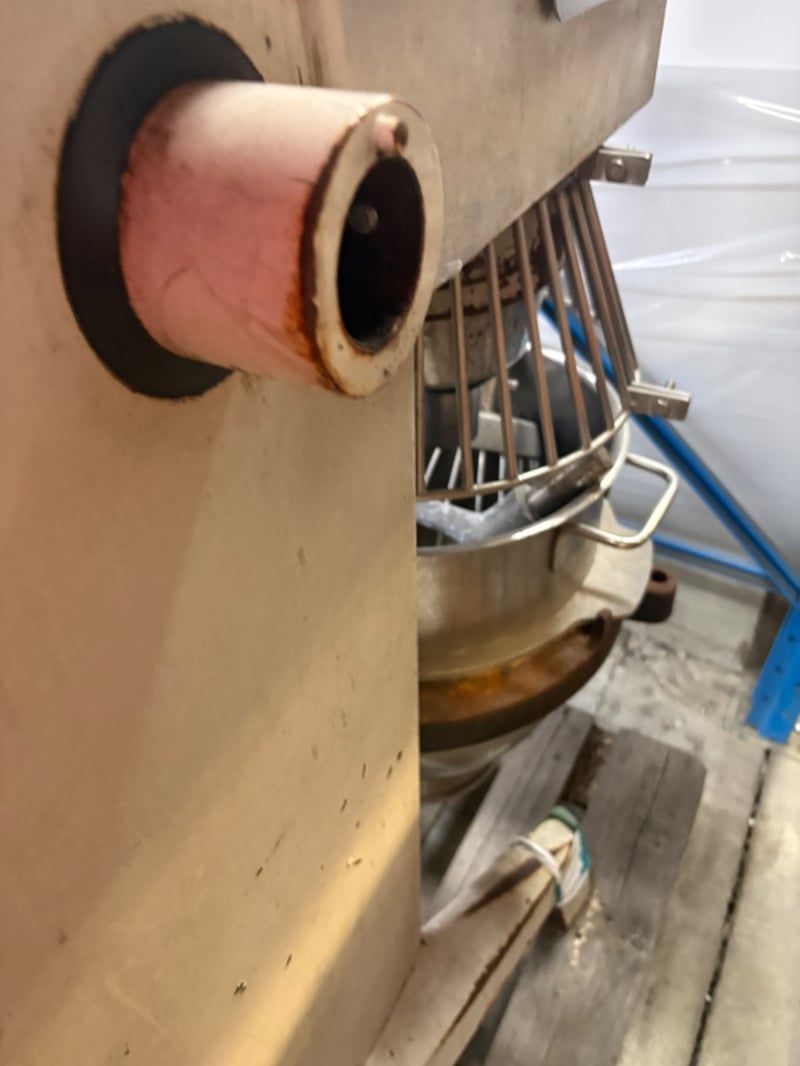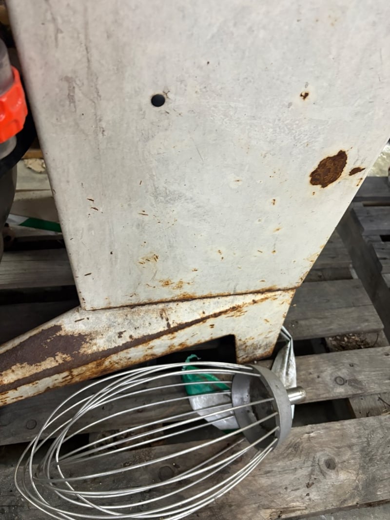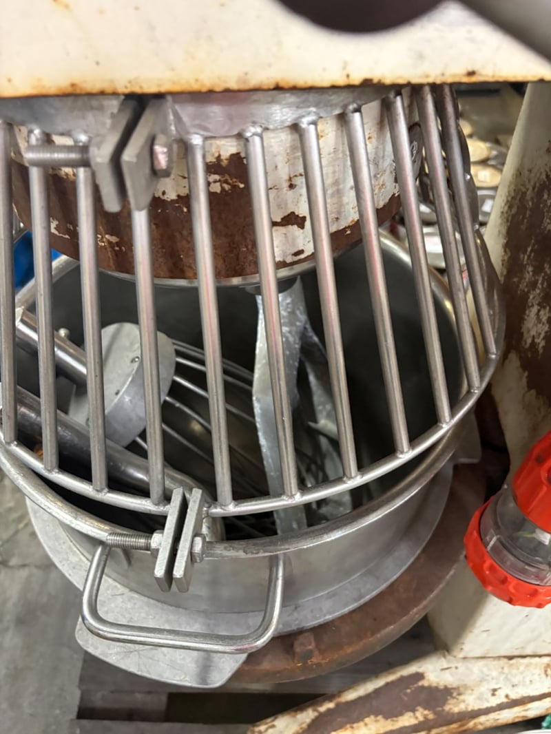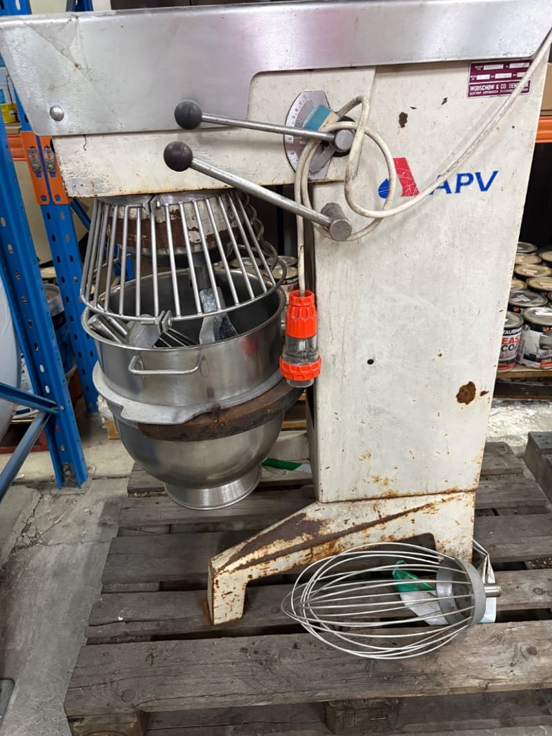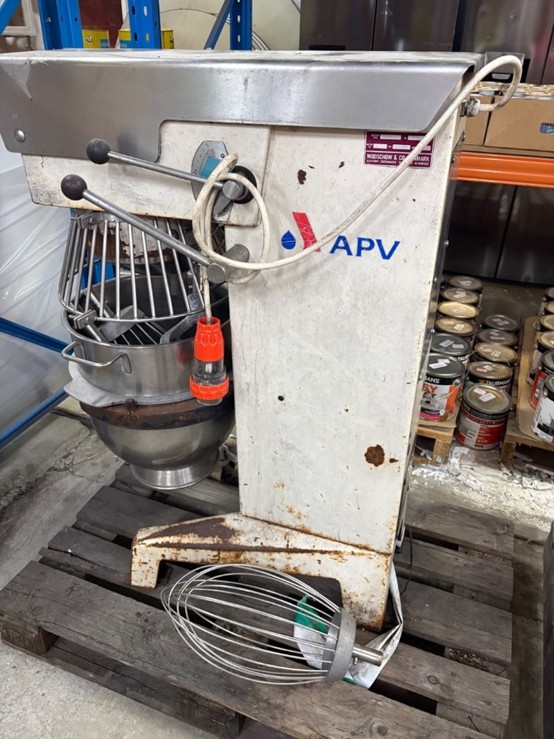 APV Commercial Planetary Mixer Heavy-duty floor-standing mixer with bowl and guard (whisk attachment included). Working condition unknown – sold as is. Dimensions: H 120cm W 90cm D 50cm