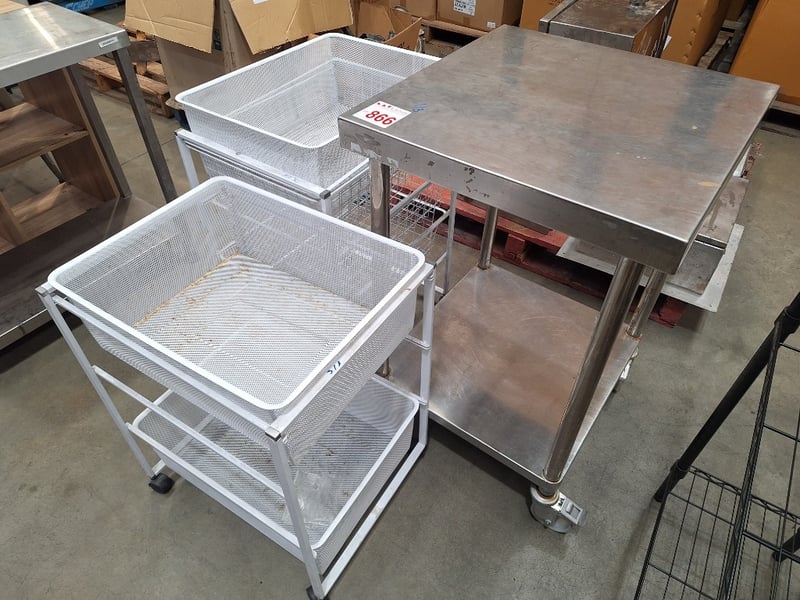 Commercial Kitchen Bench With x2 Trolley CartsBench Dimensions Approx H:900mm W:600mm D:600mmSOLD AS LOTPLEASE NOTE: INSPECTIONS HIGHLY RECOMMENDED, BUYER TO PROVIDE OWN LABOUR AND TOOLS FOR SAFE REMOVAL OF ASSET
