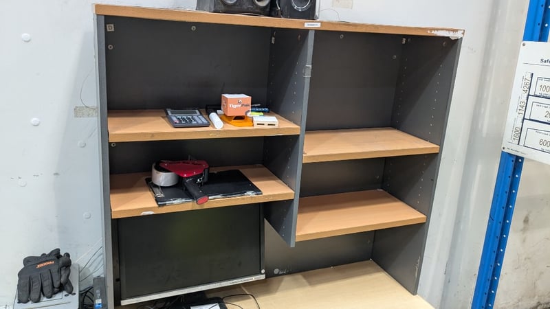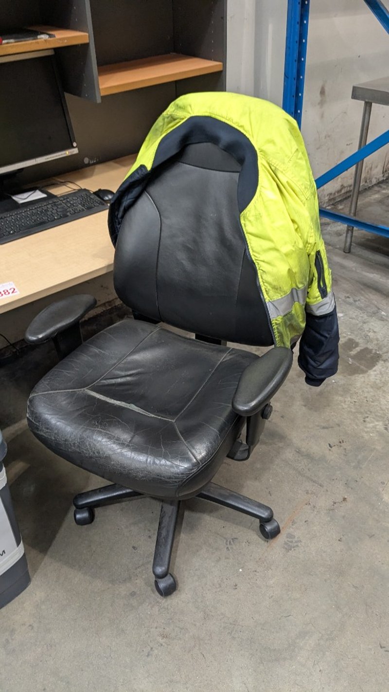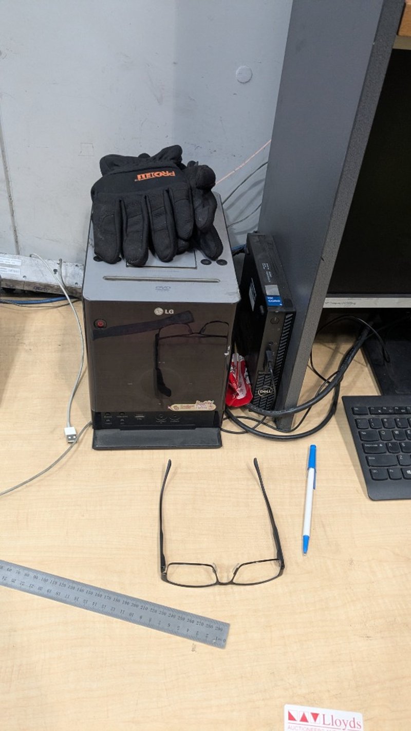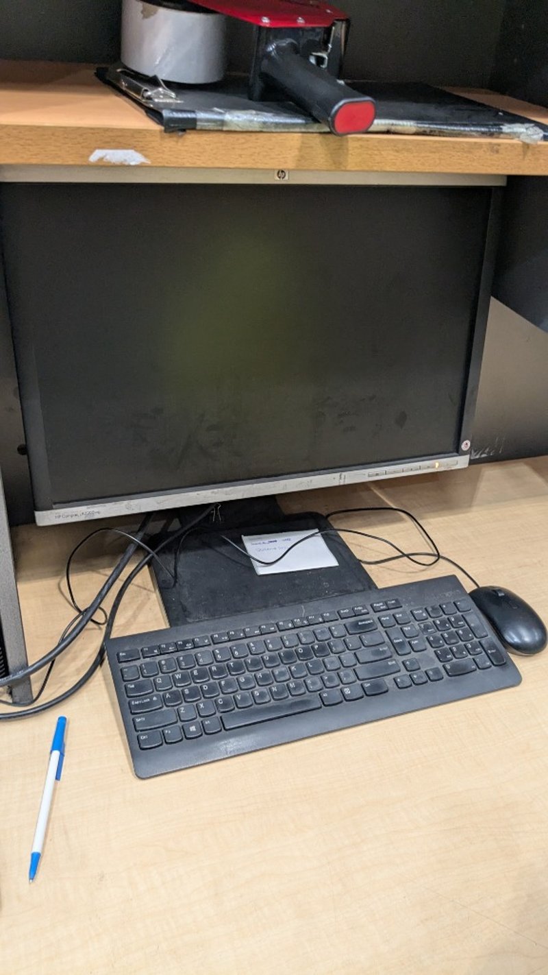 Office Desk Bundle, Includes Timber Laminate Desk, HP monitor, Desk Chair and more, Quantity to Photos SOLD AS LOT NOTE: INSPECTIONS HIGHLY RECOMMENDED