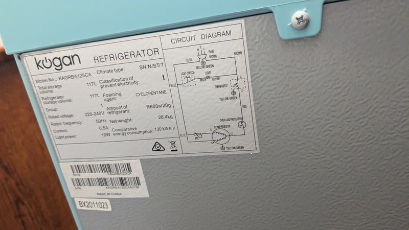 Kogan refrigerator model number: KAGRBA125CA.Total Capacity: 117 LitersEnergy Consumption: 130 kWh per yearOperating Voltage: 220-240V at 50HzDimensions: 550mm(W) x 550mm(D) x 900mm(H)