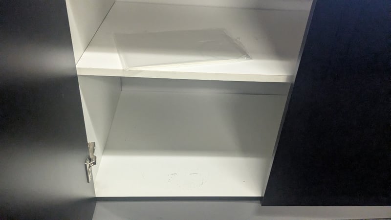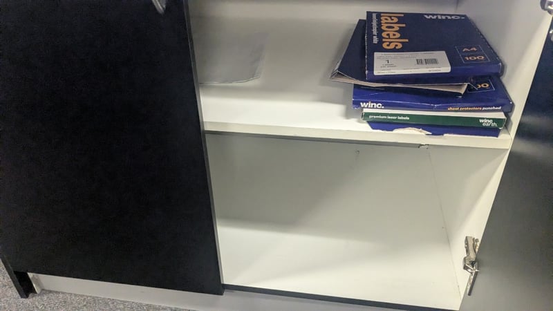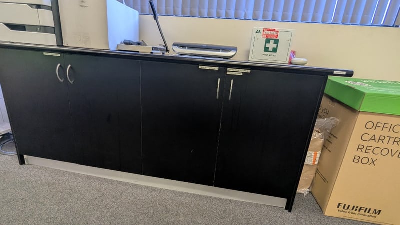 Timber Laminate Storage Cabinet, Black, Chrome Handles, Includes Paper Cutter and more, Dimensions: 2200mm(W) x 620mm(D) x 900mm(H) SOLD AS LOT NOTE: UPSTAIRS, INSPECTIONS HIGHLY RECOMMENDED, BUYER TO PROVIDE OWN LABOUR AND TOOLS FOR SAFE REMOVAL OF ASSET