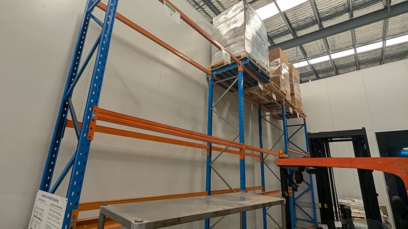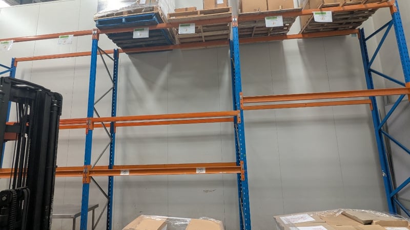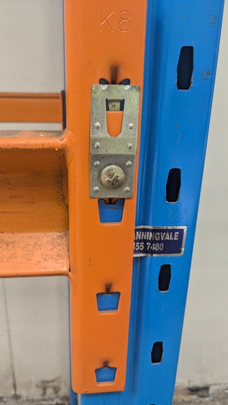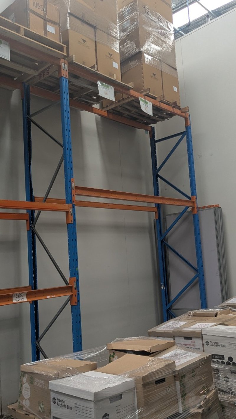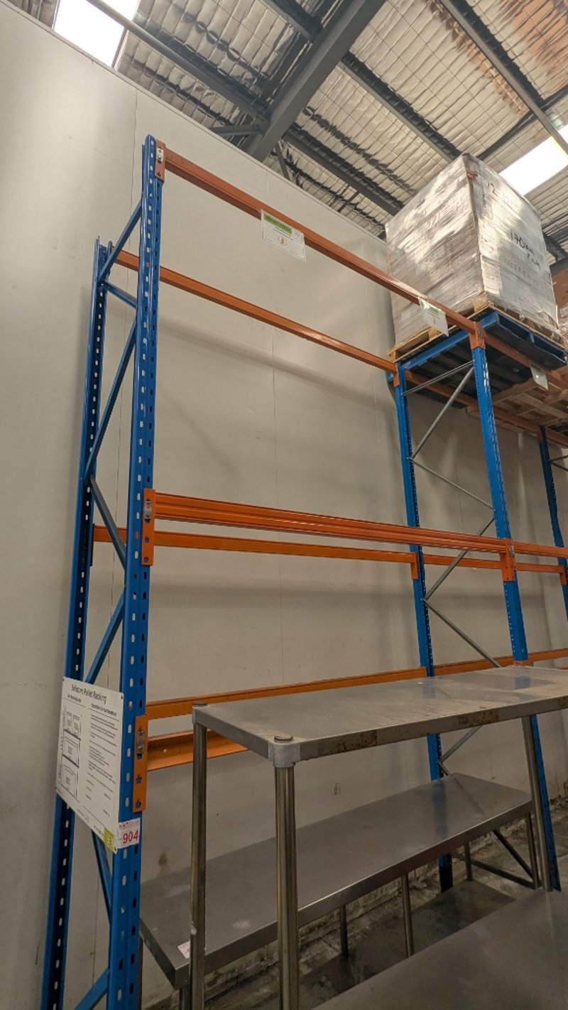 Pallet Racking, 3 Tier, 4 x Uprights, 16 x Cross BeamsDimensions: 4250mm(H) x 830mm(D) x 8200m (L) SOLD AS LOT NOTE:BOLTED TO FLOOR, CONTENTS NOT INCLUDED, INSPECTIONS HIGHLY RECOMMENDED, BUYER TO PROVIDE OWN LABOUR AND TOOLS FOR SAFE REMOVAL OF ASSET