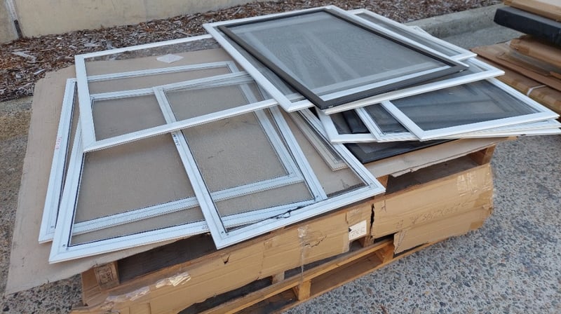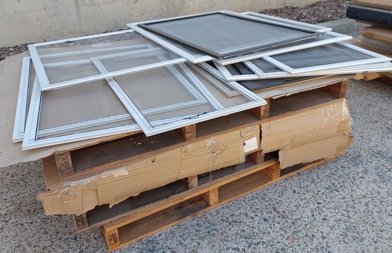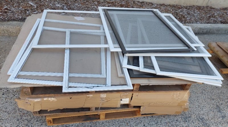Aluminum framed meah screen windows, various dimensions.Dims: 73x112cmSold as a lot.