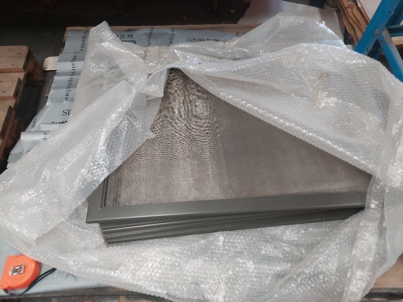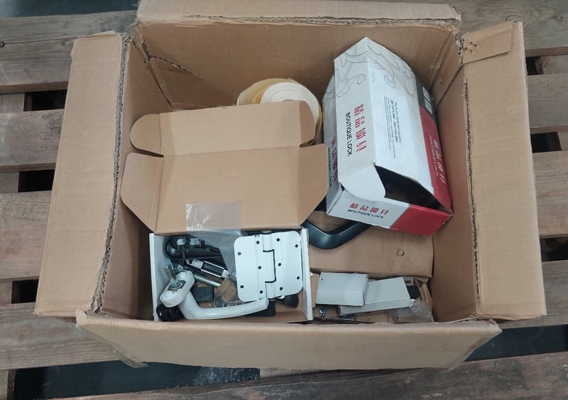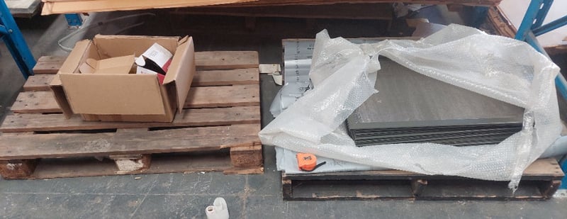 Assorted lot includes aluminium window frames meshed, door handles and more...Dims: 83cm H , 59cm W, 2cm D.Qty to pallet. Sold as lot. Notes: signs of wear.