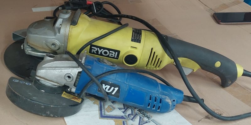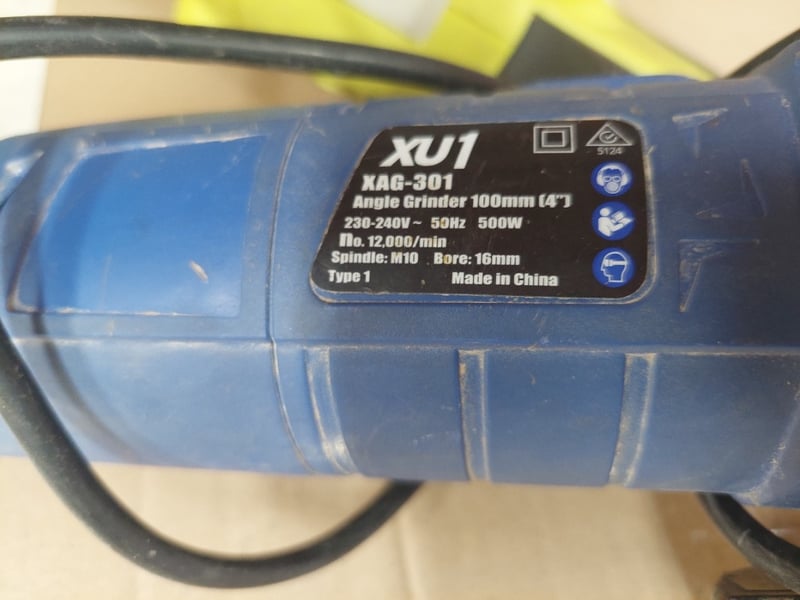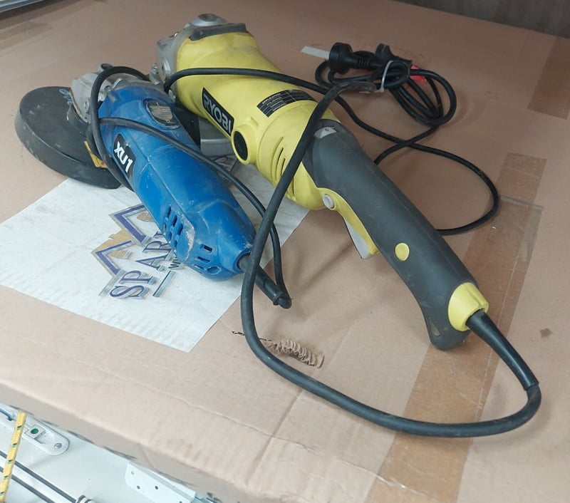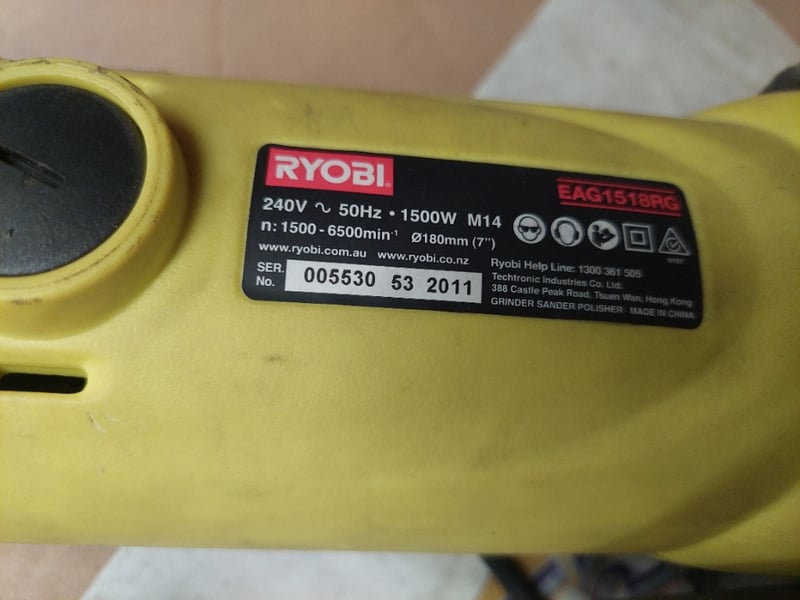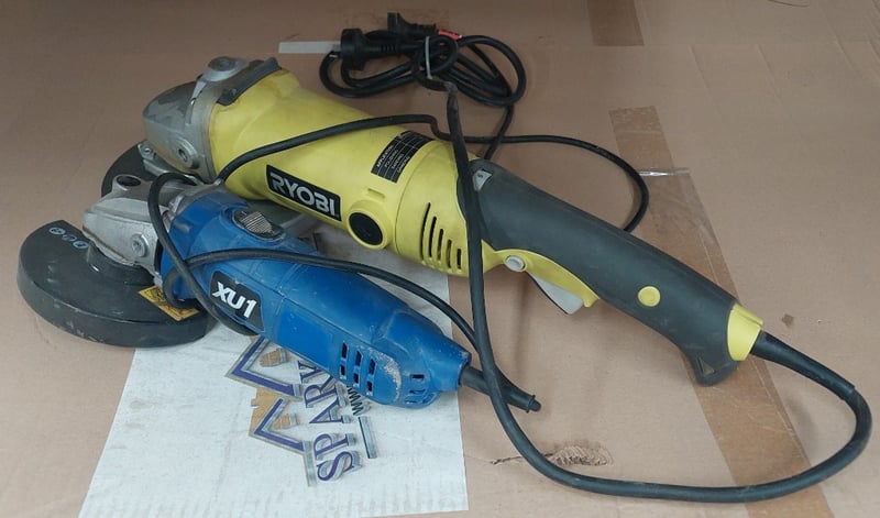 Assorted lot of Angle grinders.Ryobi Model: EAG1518RGXU1: XAG-301Sold as lot. Notes: items untested and signs of wear