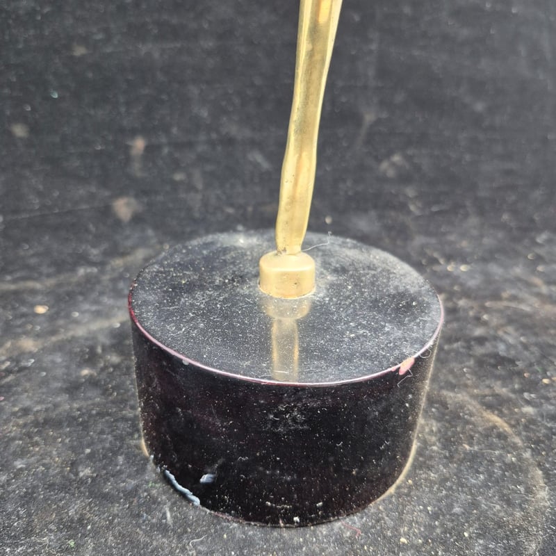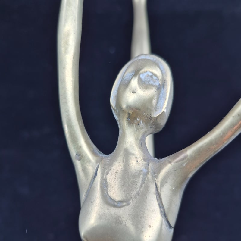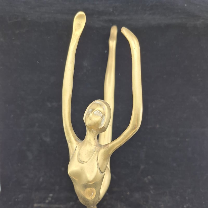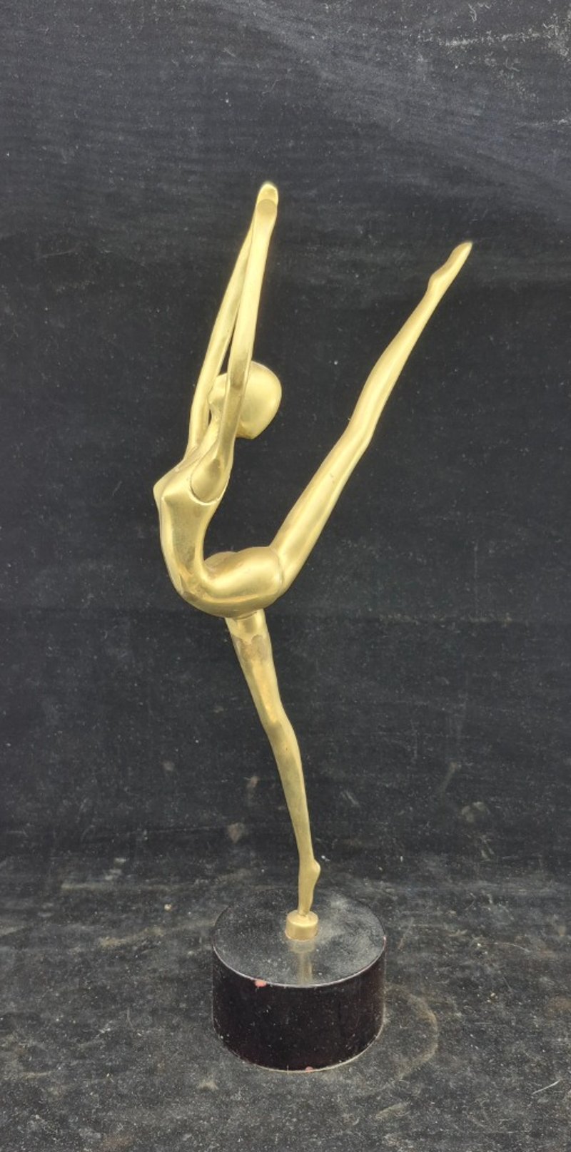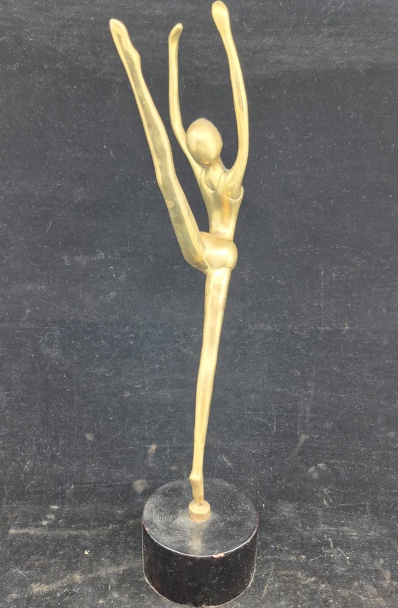FIGURINE IN ARABESQUE A Modernist Figurative Sculpture Depicting An Abstracted Female Form With Raised Arms In A Celebratory Pose. Cast In Gilt Bronze With Contrasting Silvered Bronze Details, Mounted On A Cylindrical Black Marble Base. Condition: Good - Refer To Images 587928+9