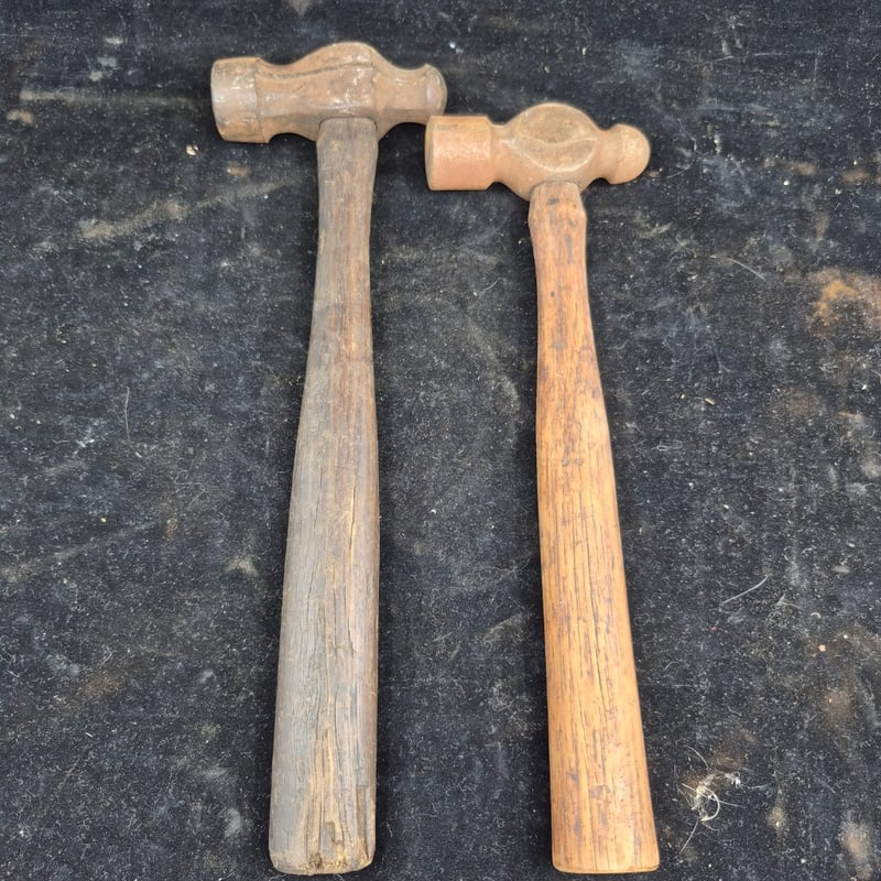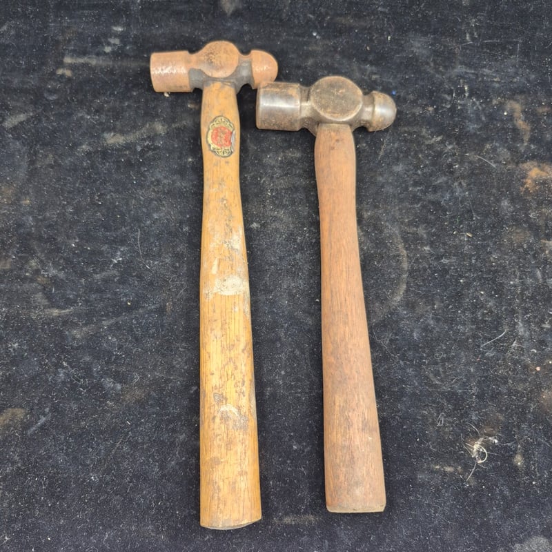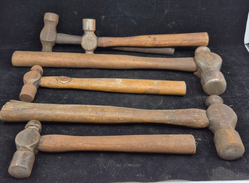 A Comprehensive Collection Of Six Vintage Hand Tools Featuring Wooden Handles And Metal Heads, Including Ball-Peen Hammers, Claw Hammers, And Mallets.