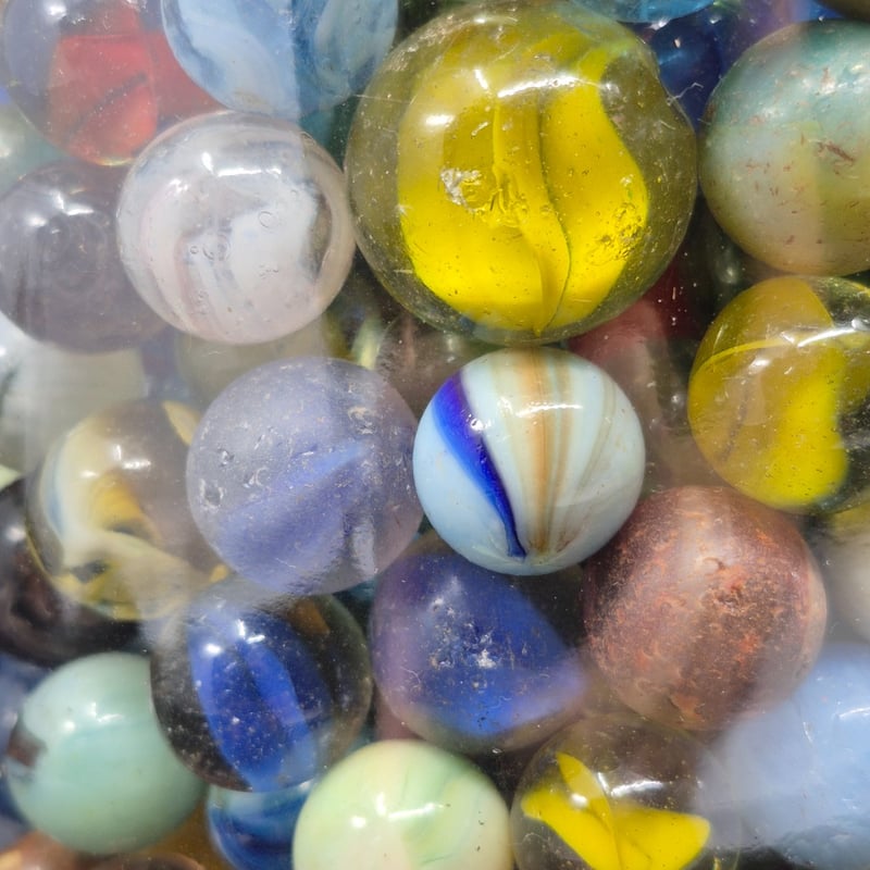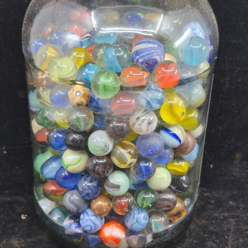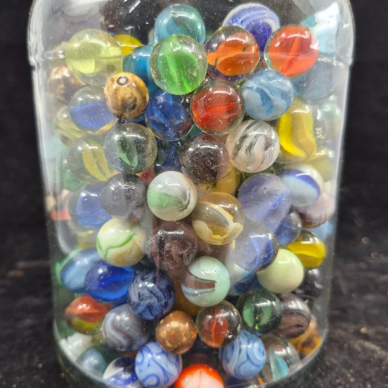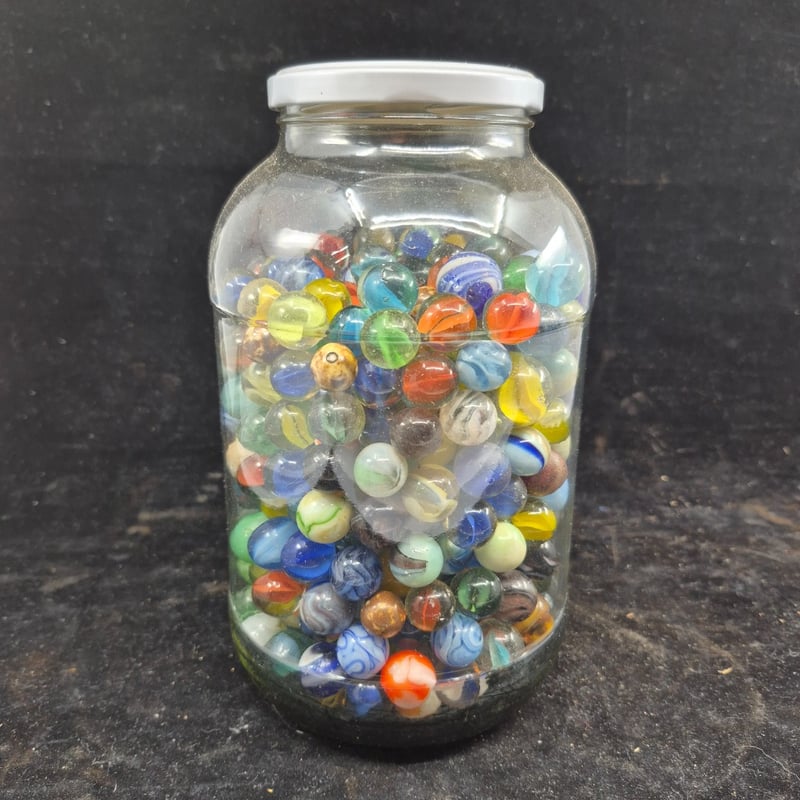 Glass Storage Jar With White Metal Screw-Top Lid Containing A Comprehensive Collection Of Marbles In Various Styles And Colours Including Solid Glass Spheres, Swirled Patterns, Cat'S Eyes, And Decorative Designs In Blues, Greens, Yellows, Oranges, Reds, And Earth Tones.