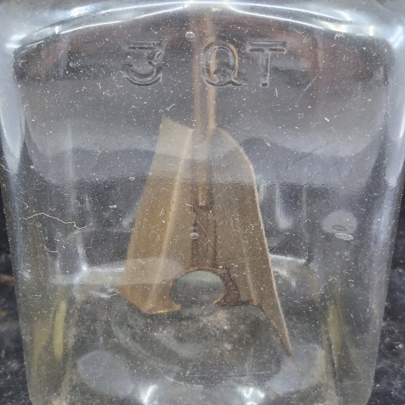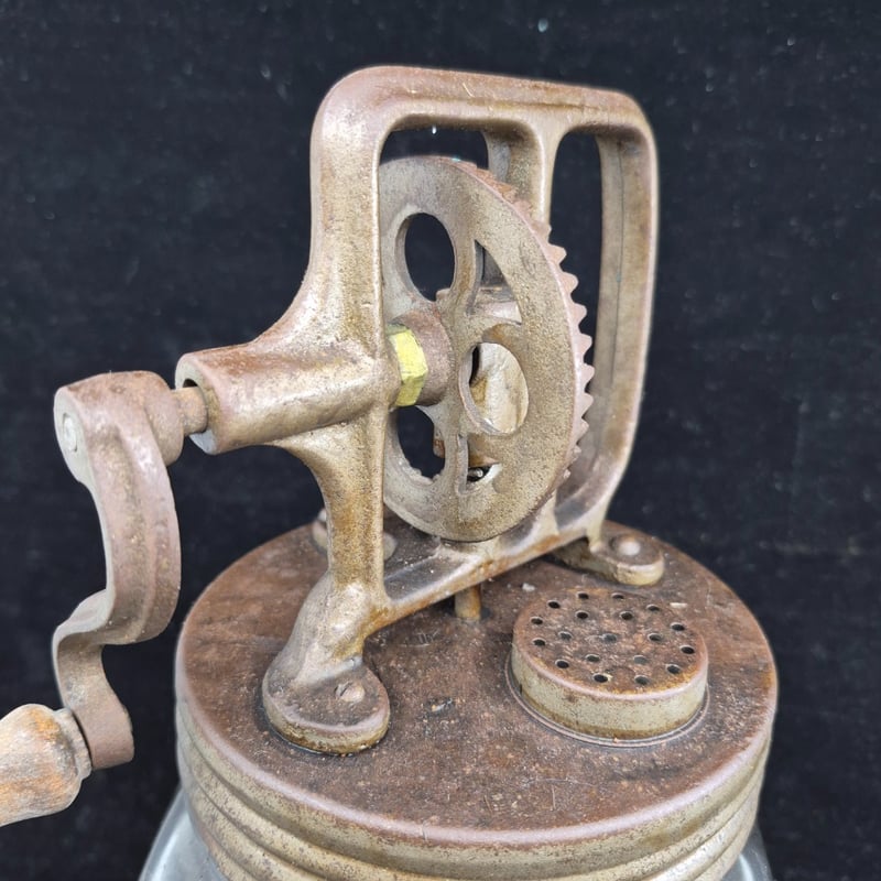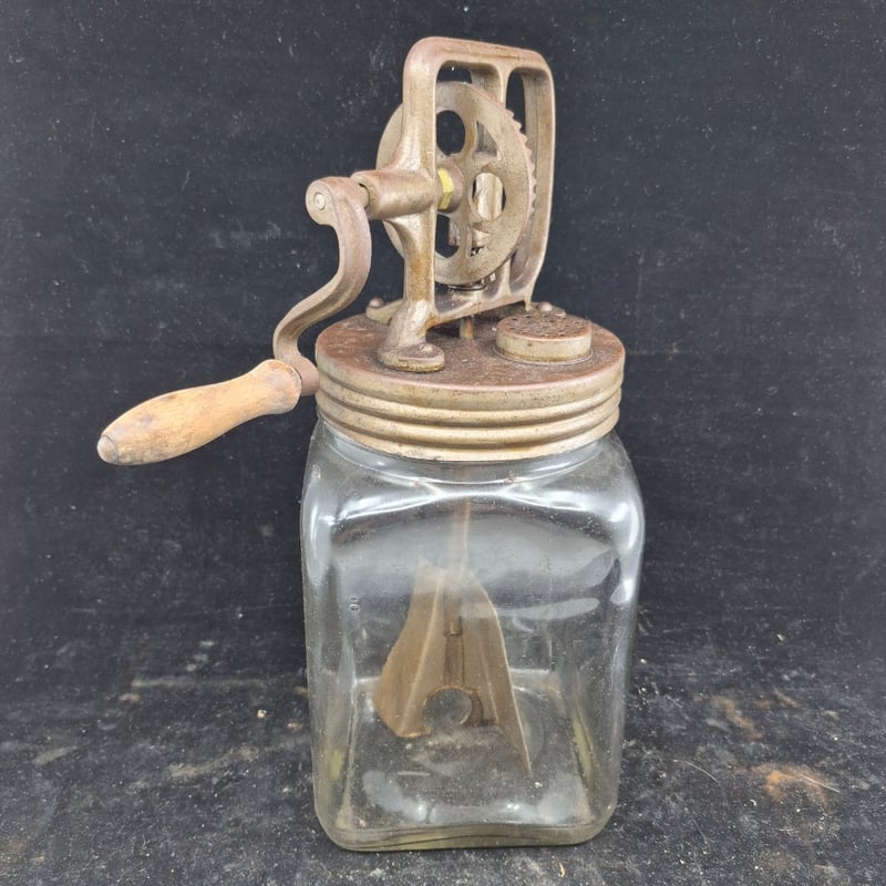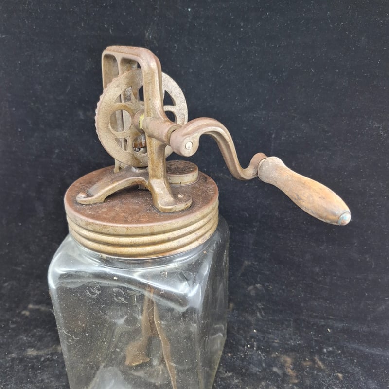 Early 20Th Century Hand-Operated Butter Churn Featuring A Cylindrical Glass Jar With Embossed "3Qt" Marking, Mounted On A Wooden Base With Brass And Metal Fittings. The Churn Incorporates A Cast Metal Frame With Decorative Perforated Brass Top Plate, A Mechanical Gear-Driven Dasher Mechanism, And A Curved Wooden Handle With Turned Finial. The Apparatus Demonstrates Traditional Dairy Equipment Engineering With Its Rotating Blade Assembly And Sealed Jar Closure System, Suitable For Domestic Butter