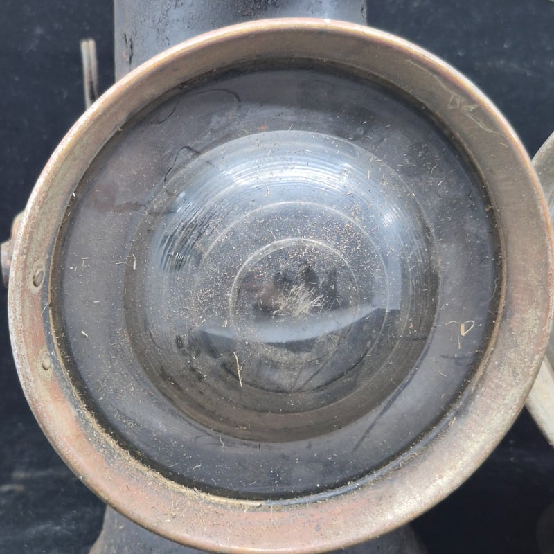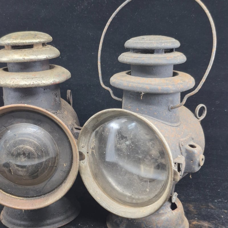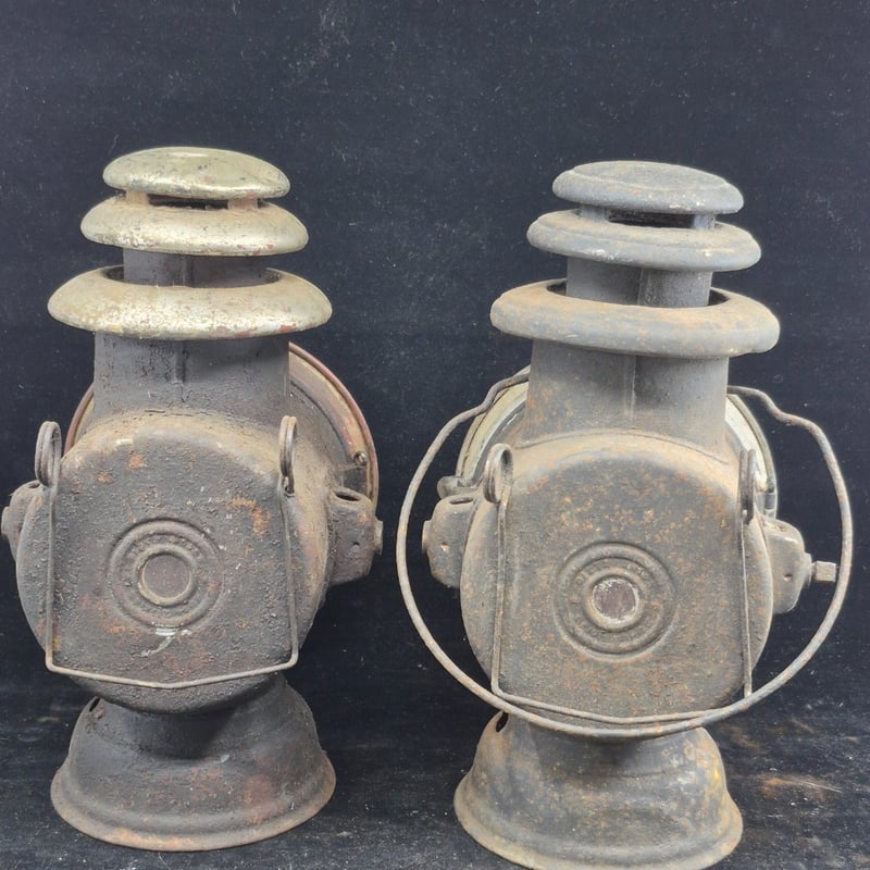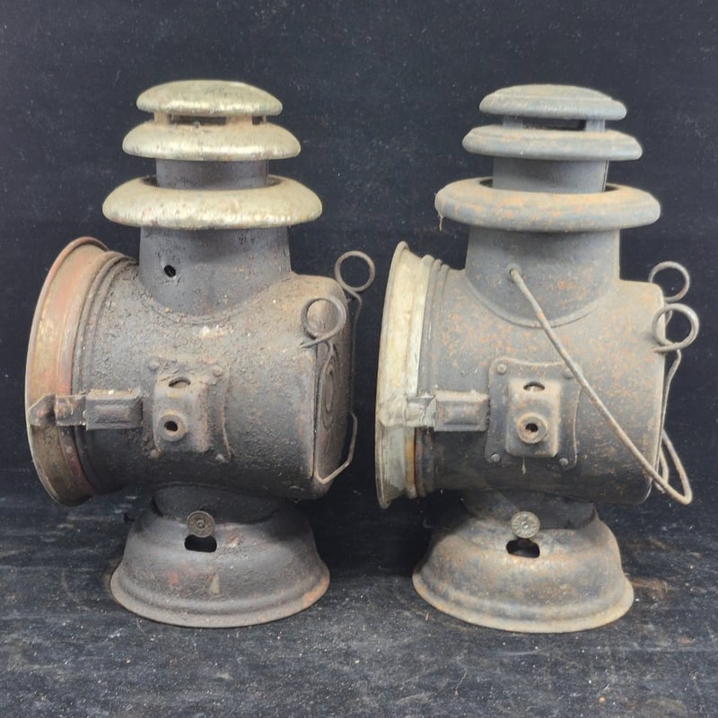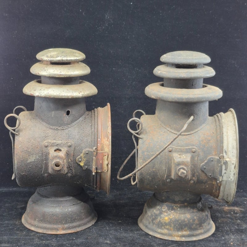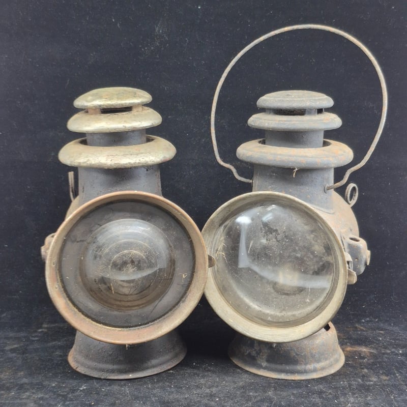OLD CAR/BUGGY LAMPS X2 Matched Pair Of Antique Metal Lanterns Featuring Tiered Pagoda-Style Tops, Side-Mounted Handles, And Large Hemispherical Glass Lenses With Concentric Fresnel Lens Patterns. Condition: Good - Refer To Images 587928+14