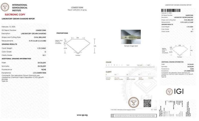 Please note that while all lab grown diamonds listed include certification, the report number or identification may vary upon arrival. This is due to standard manufacturing and batching processes. However, the diamond’s specifications — including carat, color, cut, and clarity — will match or may even exceed those advertised.
