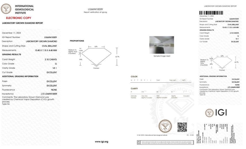 2.10 CARAT OVAL SHAPE DIAMOND G/VS1 Igi Certificate # Lg 669418309Laser Inscribed : Labgrown Igi Lg 669418309Cut : ExcellentPolish : ExcellentSymmetry : ExcellentFlourescence : NoneType : Cvd Condition: Good - Refer Images 0488762+77