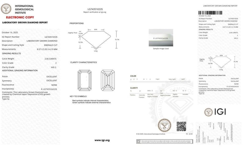 2.06 CARAT EMERALD CUT DIAMOND F/VVS2 Igi Certificate # Lg 743516535Laser Inscribed : Labgrown Igi Lg 743516535Polish : ExcellentSymmetry : ExcellentFlourescence : NoneType : Cvd Condition: Good - Refer Images 0488762+110