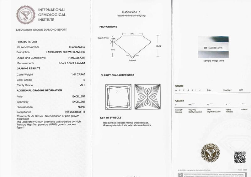 1.44 CARAT PRINCESS CUT DIAMOND E/VS1 Igi Certificate # 683566116Laser Inscribed : Labgrown Igi 683566116Polish : ExcellentSymmetry : ExcellentFlourescence : NoneType : Hpht Condition: Good - Refer Images 0488762+14