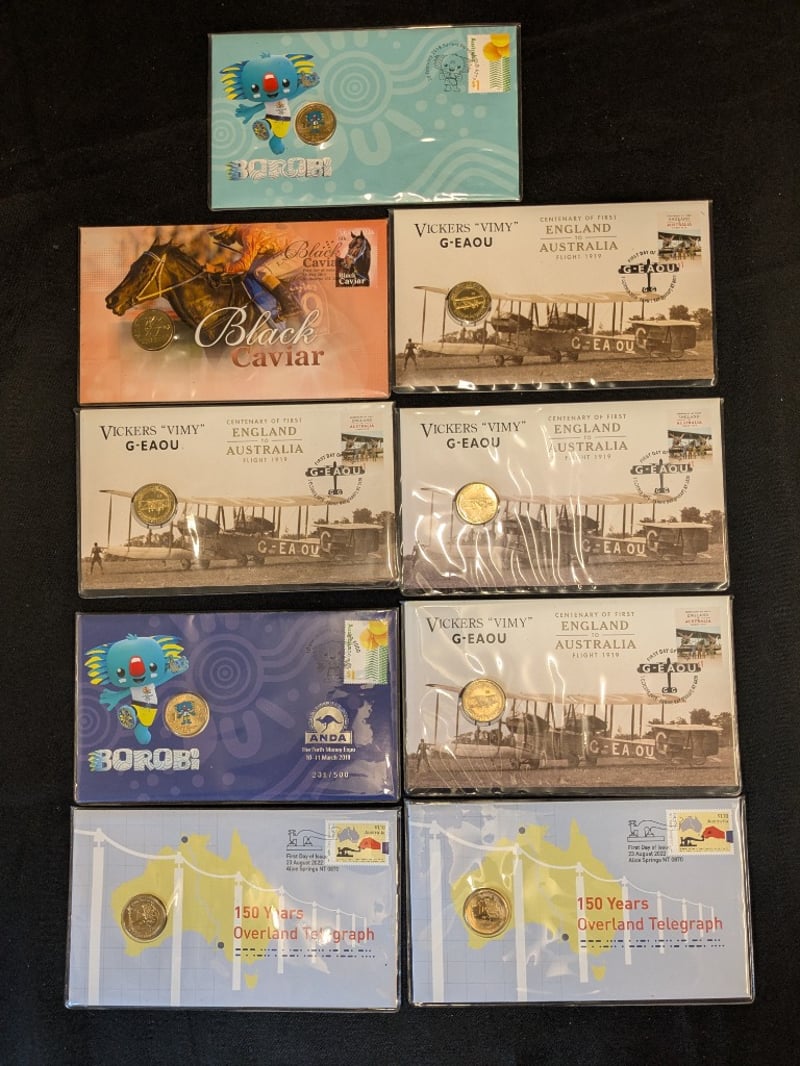 COLLECTION OF AUSTRALIAN POST COMMEMORATIVE COINS Includes 2018 Borobi Gold Coast Commonwealth Games Coins, 150 Years Overland Telegraph Coin, Centenary Of First England To Australia Flight Vickers 'Vimy' G-Eaou Coin, 2013 Black Caviar Coin Condition: Unc 584448+44