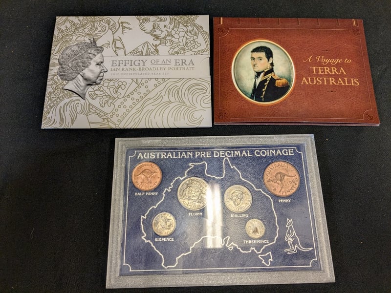 COLLECTION OF UNCIRCULATED COIN SETS Includes A Voyage To Terra Australis Privy And Mintmark Coin Set, Australian Pre Decimal Coinage Set, 2017 Effigy Of An Era Uncirculated Year Set Condition: Unc 584448+47