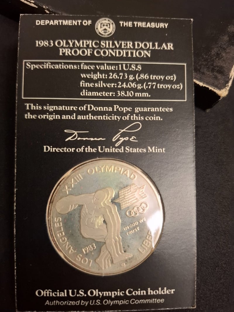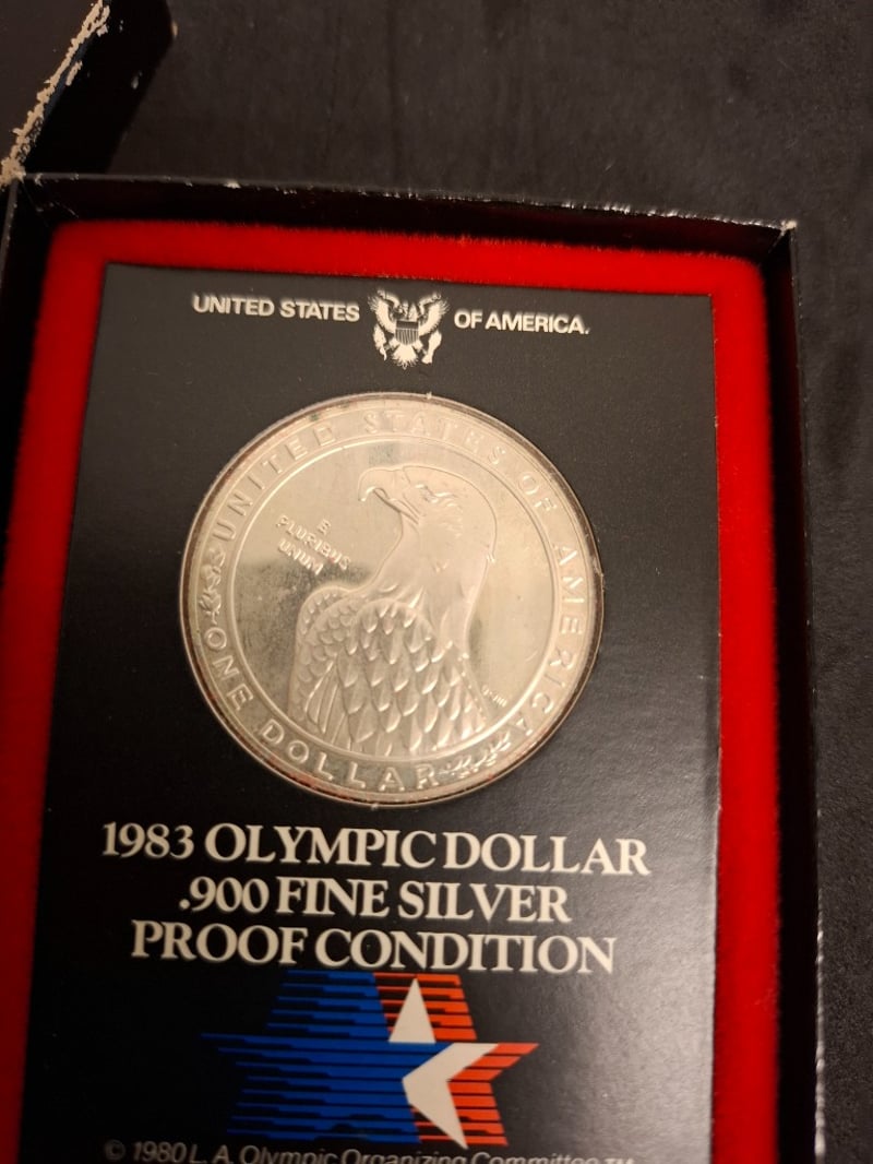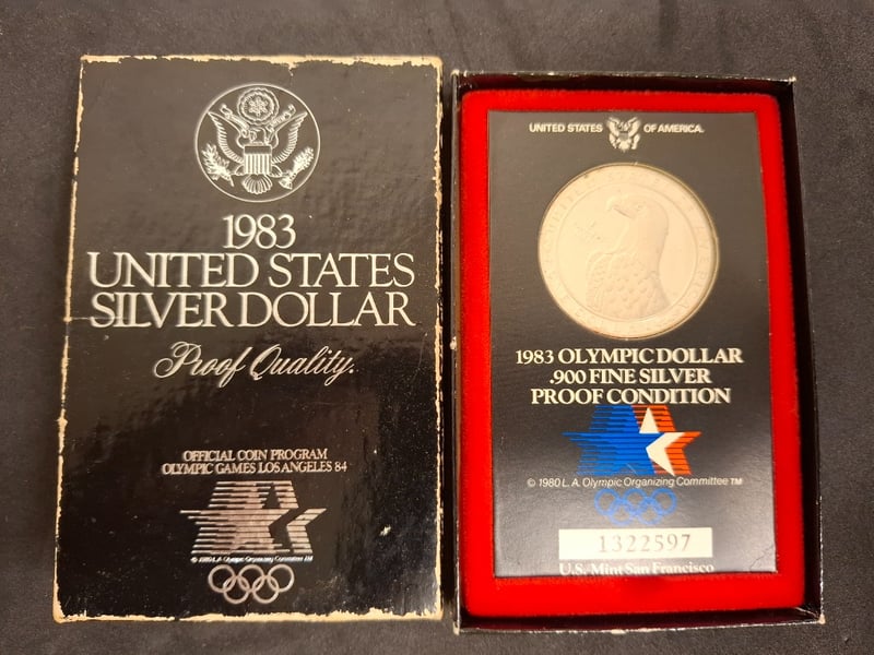 1983 UNITED STATES OLYMPIC SILVER DOLLAR PROOF SET 1983 Olympic Silver Dollar Proof Set Comprises .900 Fine Silver Dollars Commemorating The Los Angeles 1984 Olympic Games. Weighs 26.73 Grams (.86 Troy Oz) With 24.06 Grams (.77 Troy Oz) Of Fine Silver Content And Measures 38.10 Mm In Diameter. Condition: Proof 584448+78