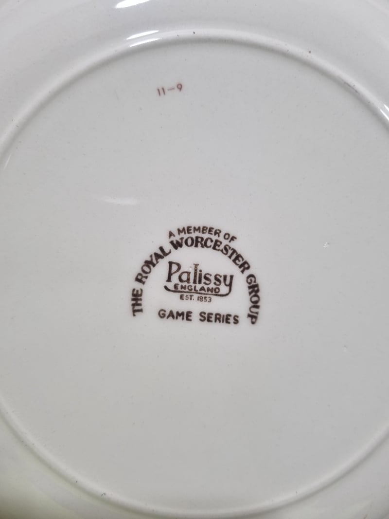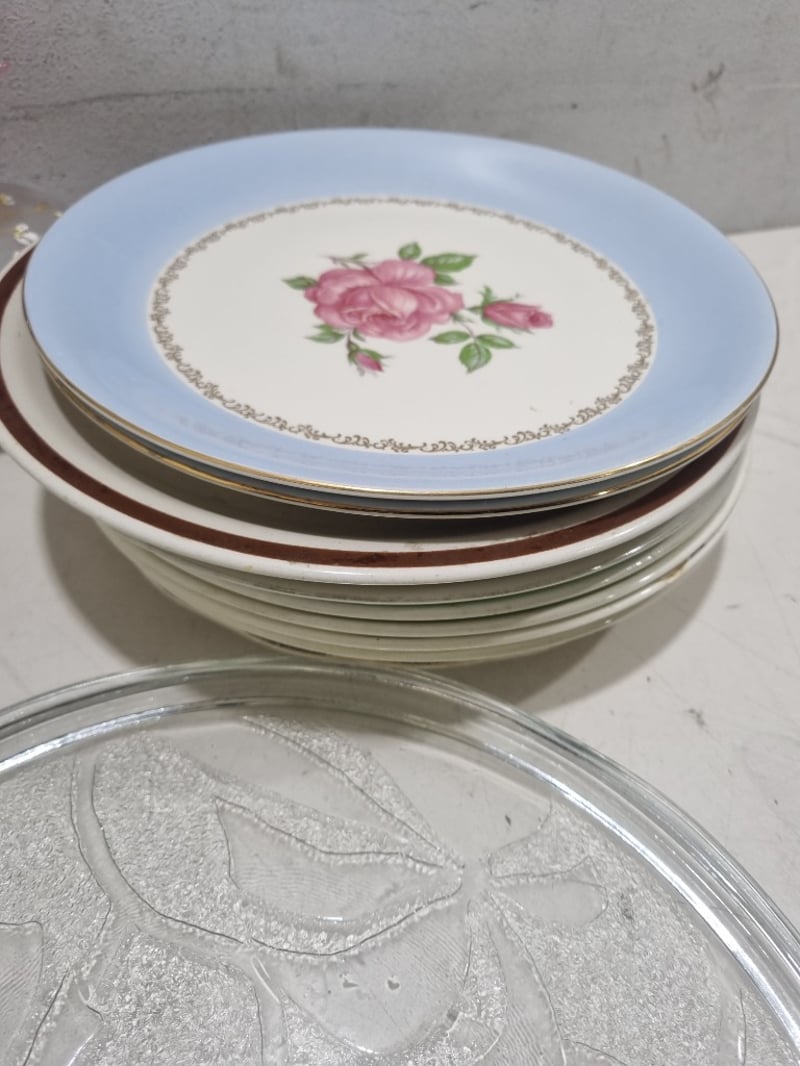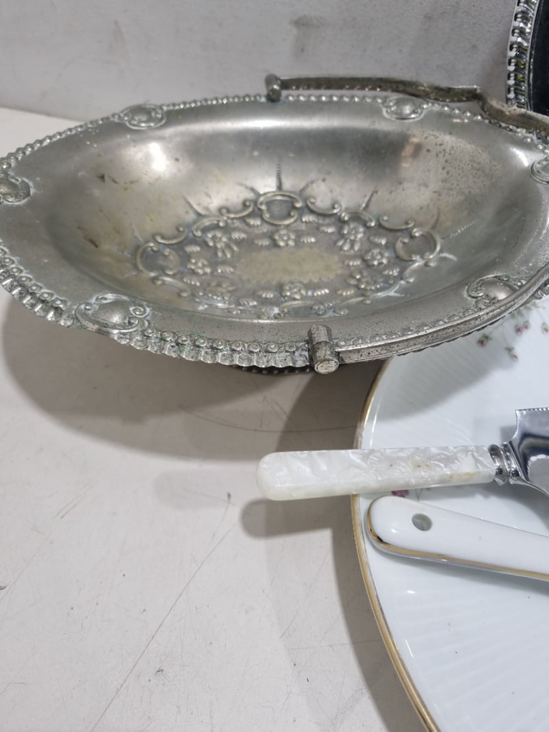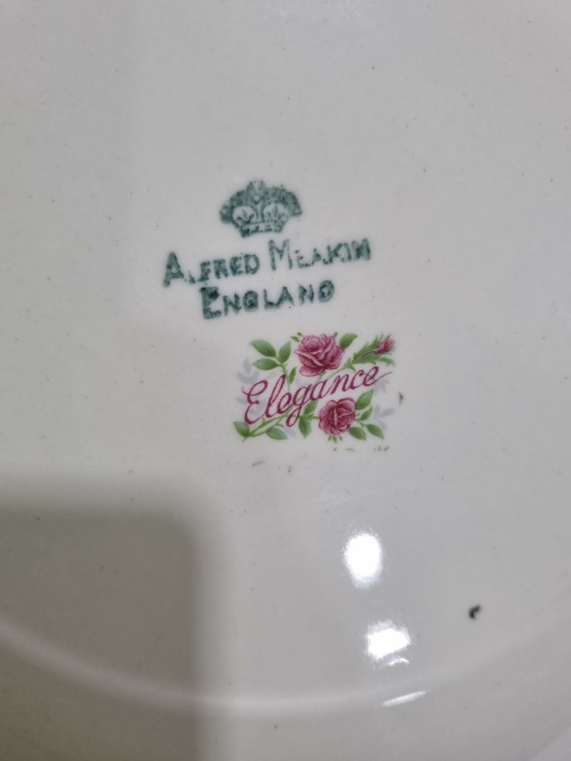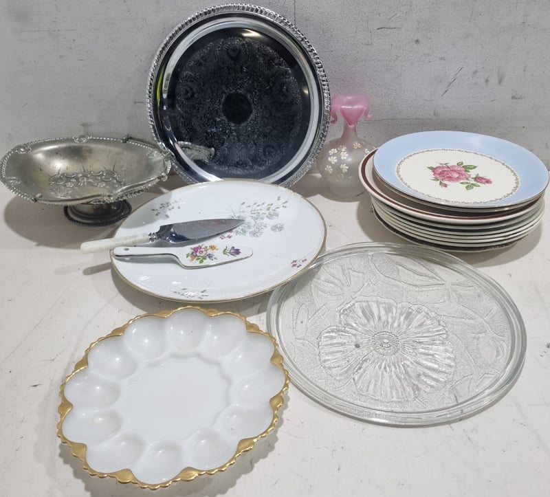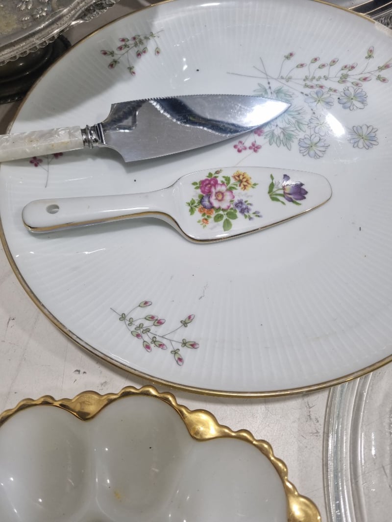 Dinnerware collection featuring fine porcelain and china pieces from prestigious English and Japanese manufacturers. Collection includes Alfred Meakin "Elegance" pattern dinner plates with pink floral roses, Myott Son & Co. Staffordshire leaf-shaped bread plate, Hira Fine China Japanese dinner service pieces, Woodhaven Collection stoneware, and Palissy Game Series plate. Accessories include decorative serving utensils with mother-of-pearl handles, ornate silver-plated trays with embossed fruit and floral motifs, clear glass serving platters. Sold as lot Note: signs of wear