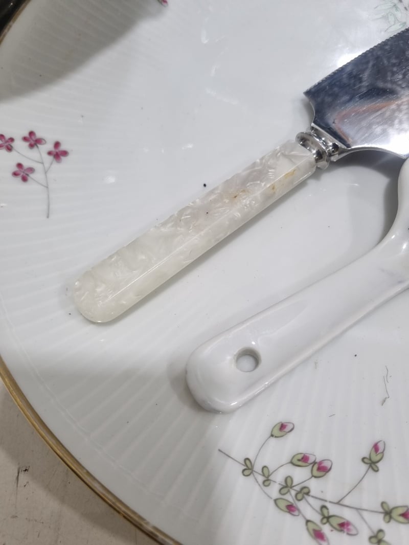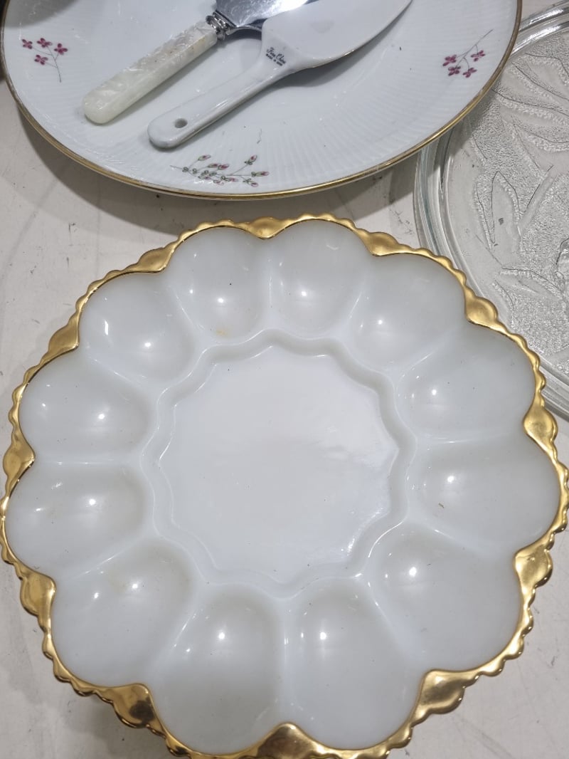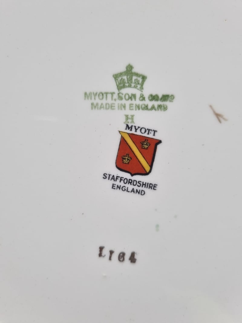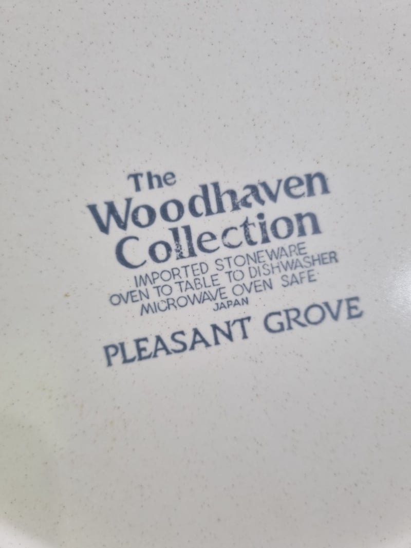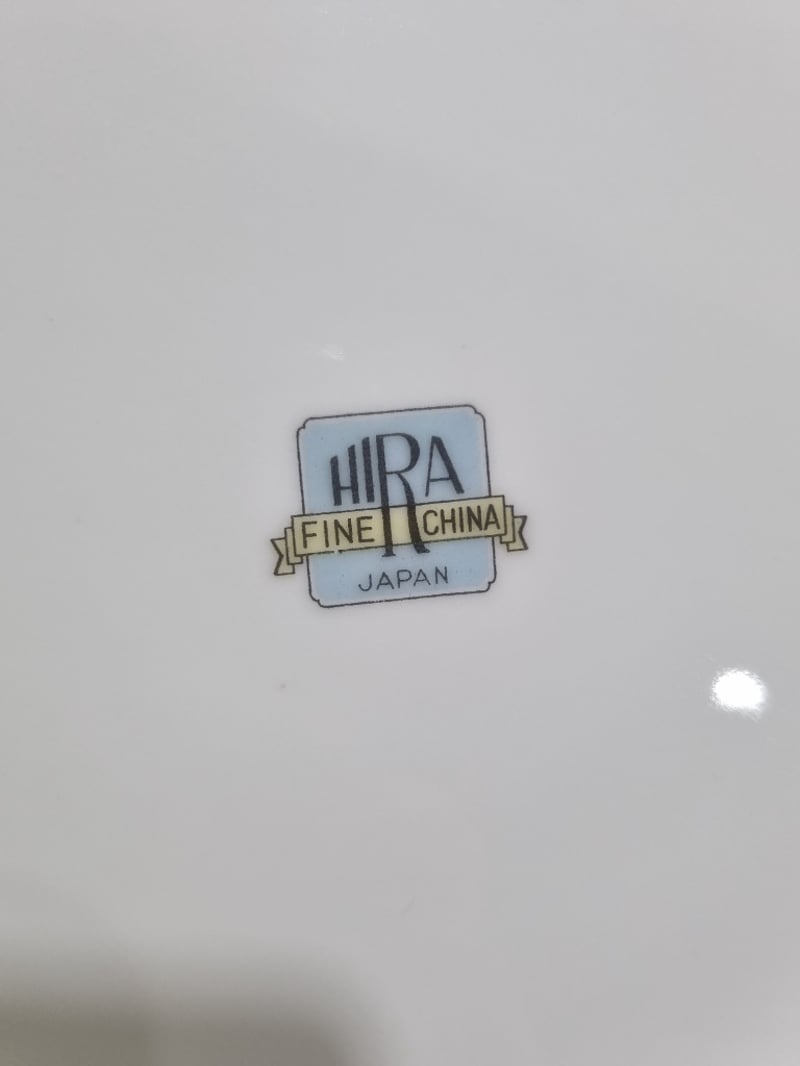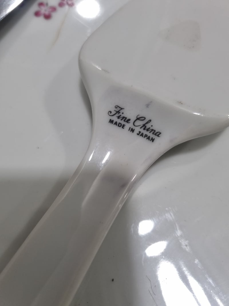 Dinnerware collection featuring fine porcelain and china pieces from prestigious English and Japanese manufacturers. Collection includes Alfred Meakin "Elegance" pattern dinner plates with pink floral roses, Myott Son & Co. Staffordshire leaf-shaped bread plate, Hira Fine China Japanese dinner service pieces, Woodhaven Collection stoneware, and Palissy Game Series plate. Accessories include decorative serving utensils with mother-of-pearl handles, ornate silver-plated trays with embossed fruit and floral motifs, clear glass serving platters. Sold as lot Note: signs of wear