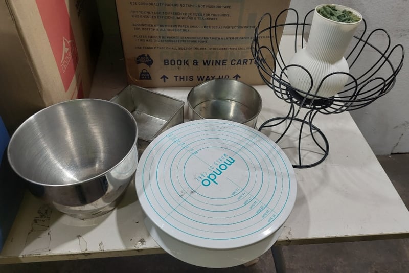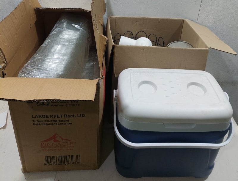 Assorted items including, large rpet rectangle lids, cooler box and more... Sold as a lot. Note: signs of wear.