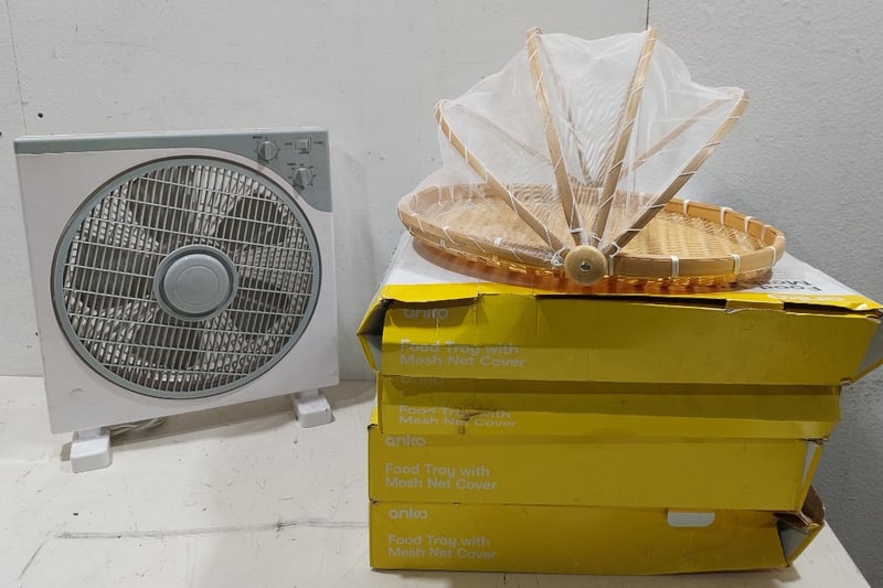 Assorted items including, x4 Anko food tray with mesh and a portable box fan.Sold as a lot.Note: item is untested, signs of wear.